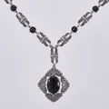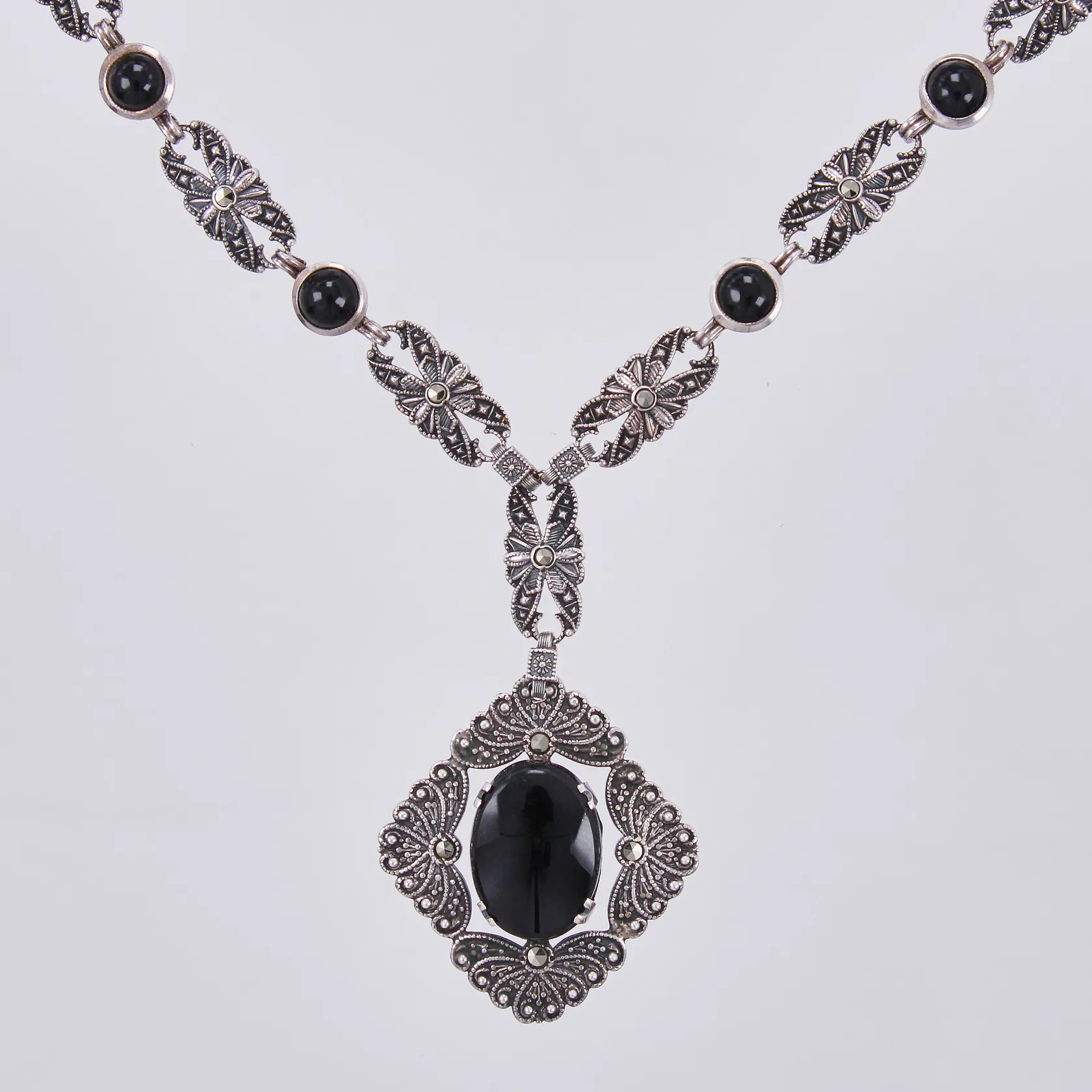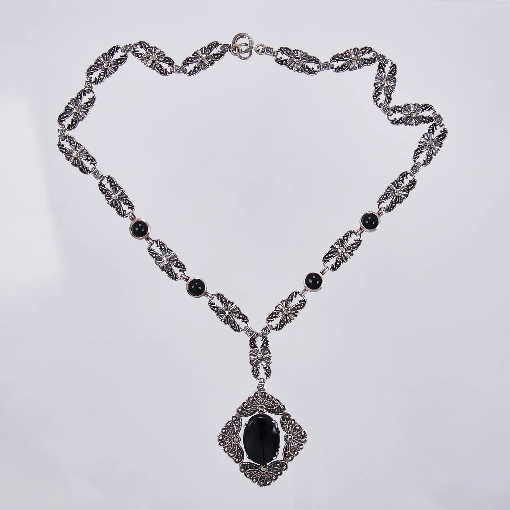Collier med onyx och markasiter längd: ca 38cm bredd: ca 8-55mm, ostämplat silver Vikt: 29,7 g.
