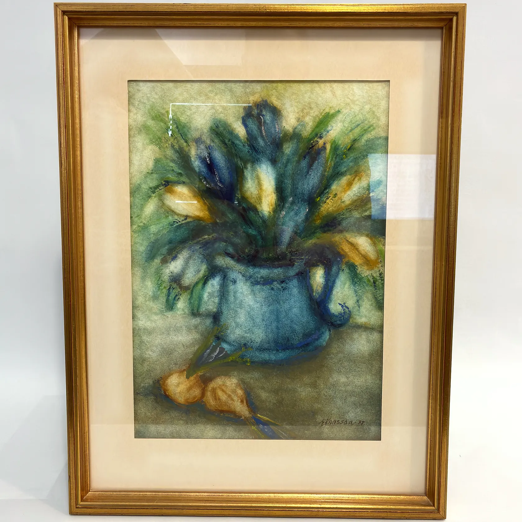Tavla gouache av Alma Hansson, Krokus i kruka, träram med glas, rammått 38x49cm, signerad Skickas med postpaket. Omfattas av BUS-avgift.