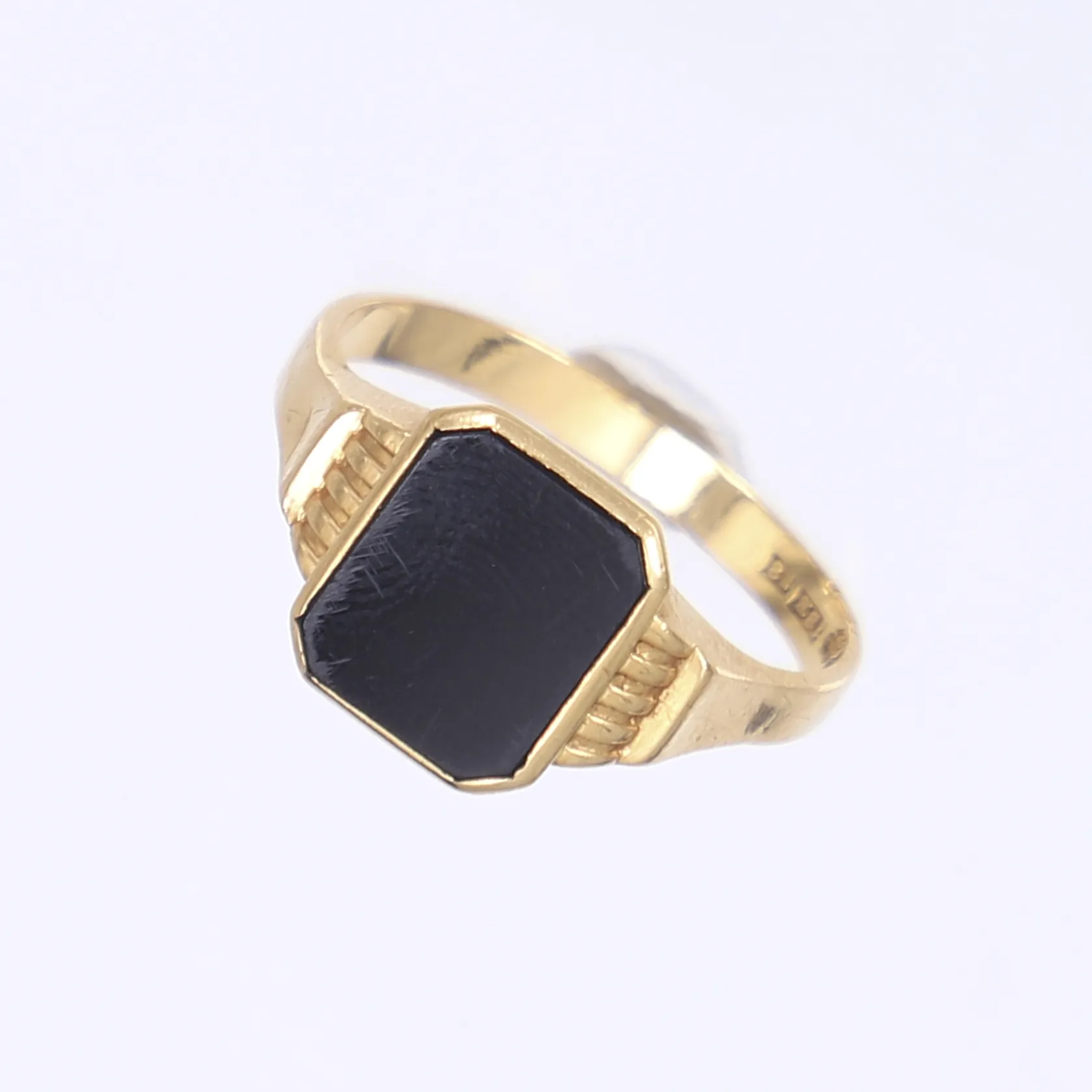Ring med svart onyx, stl 20, bredd 3-11mm, K & EC, Göteborg 1950, 18K Vikt: 4 g.