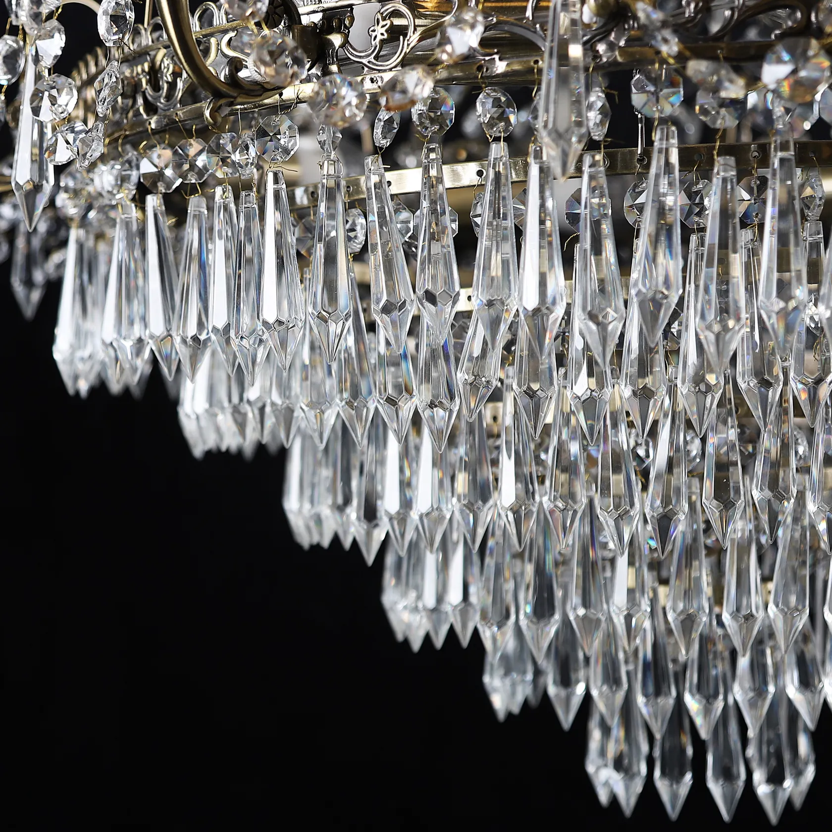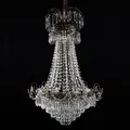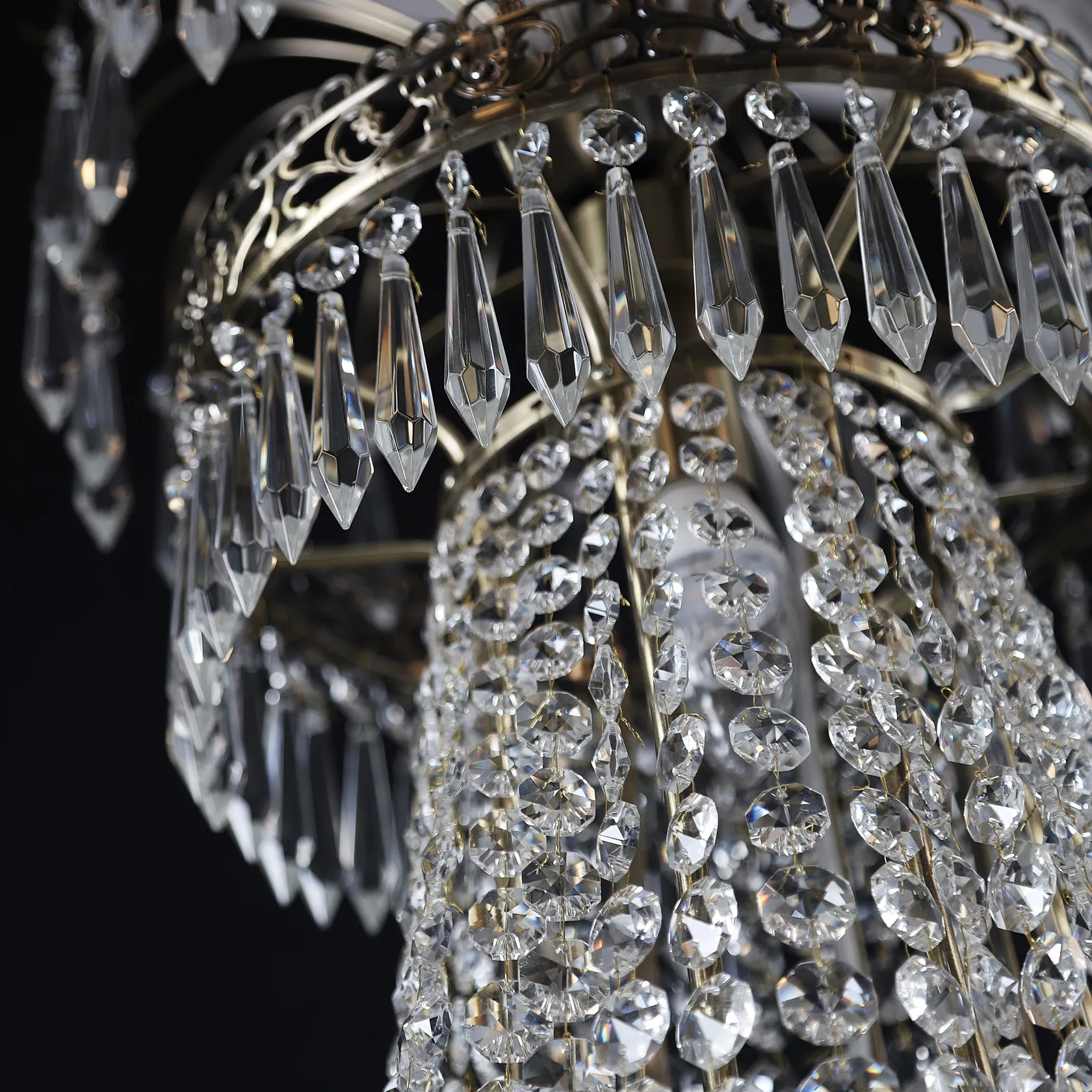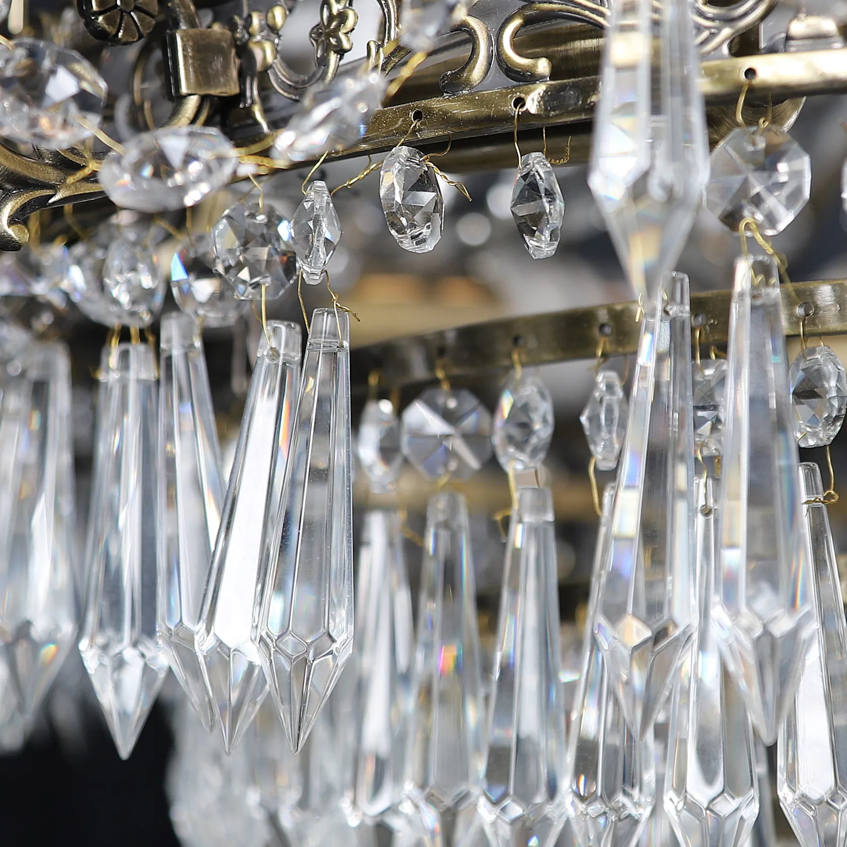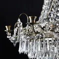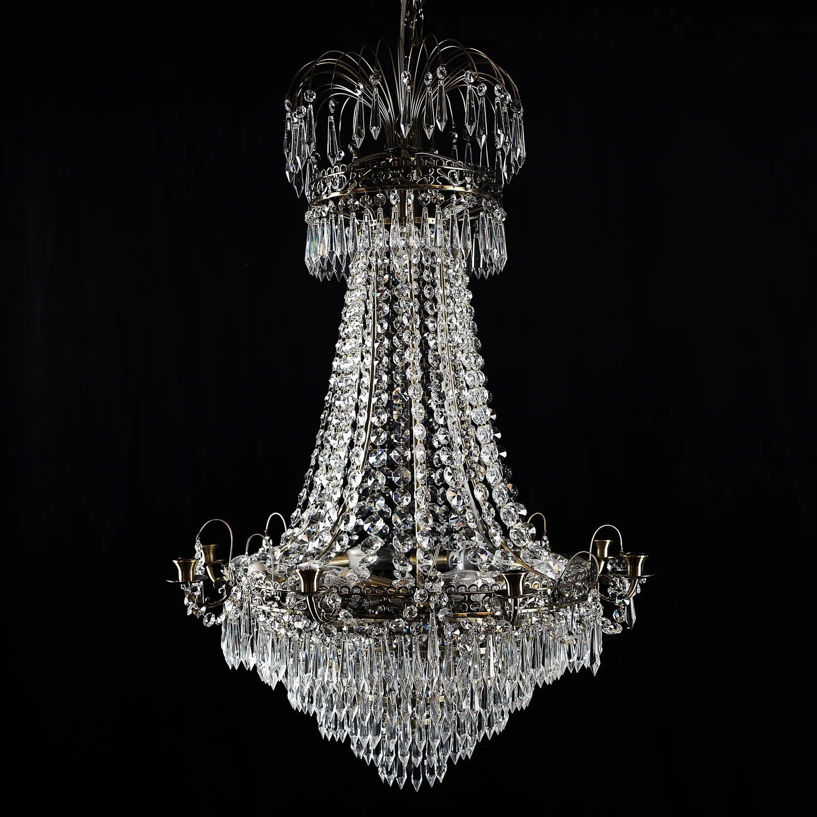 Ljuskrona för åtta ljus, Empirestil, "Läckö", Markslöjd, modern tillverkning, metallstomme, behängd med olikslipade prismor i bland annat krönande plym och avslutande piggbotten, 5 elektriska ljuspunkter, höjd ca 90cm, bredd ca 60cm, originalkartong med skador, några prismor saknas, ej funktionstestad. Skickas med postpaket.