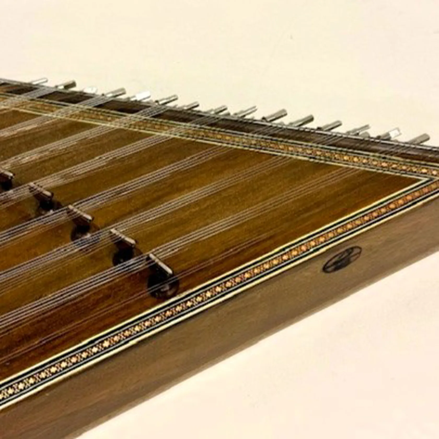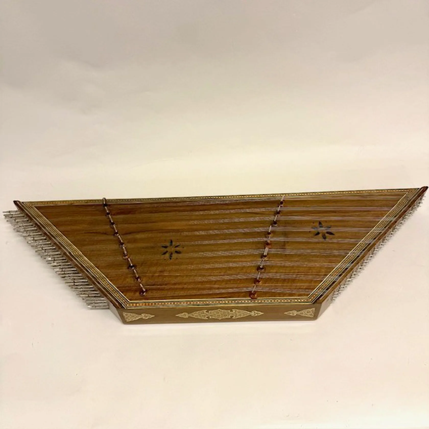 Hammardulcimer som i Norden kan kallas Hackbräde, i Öst kallas den Zimbalom och i arabvärlden Santur eller Santour, 90x27cm, trä med inläggningar, lätta märken, repor, inklusive slagklubbor, tillhörande väska, slitage Skickas med Bussgods eller PostNord.