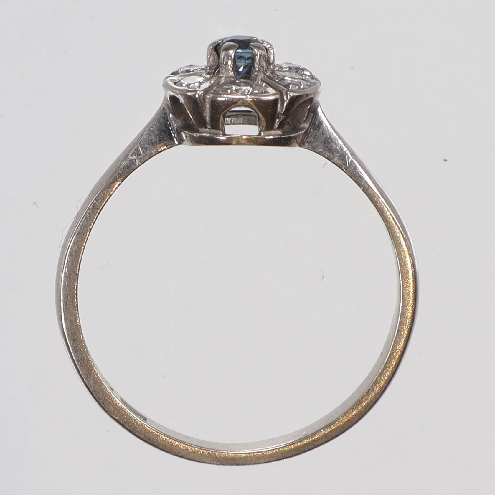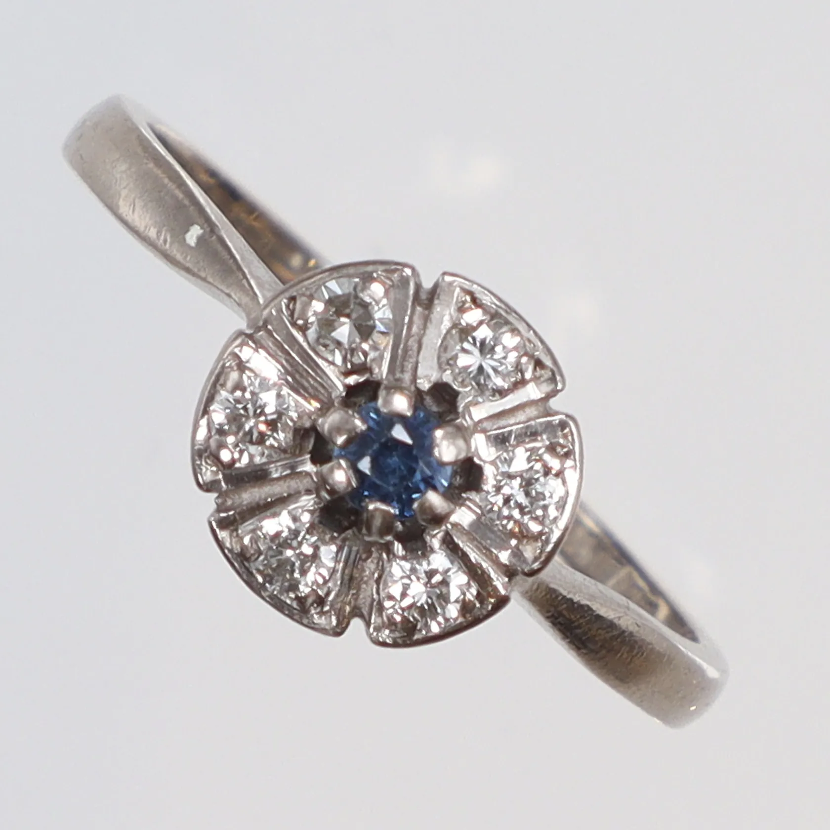 Ring i vitguld carmosé med blå sten samt diamanter 6xca0,03ct stl 17 bredd 2-8mm, BEH (Bengt Hallberg) Köping 1985, 18K Vikt: 2,5 g.