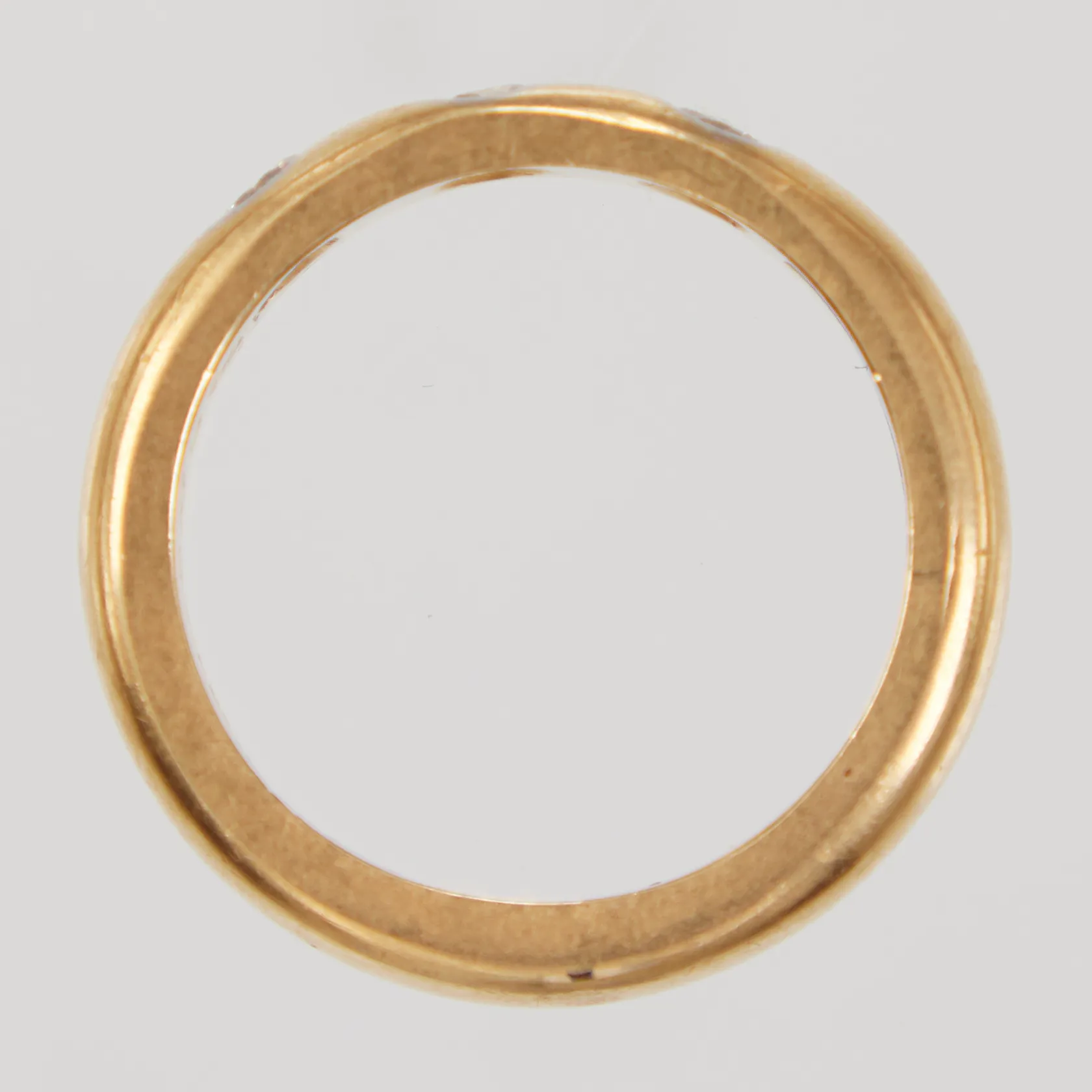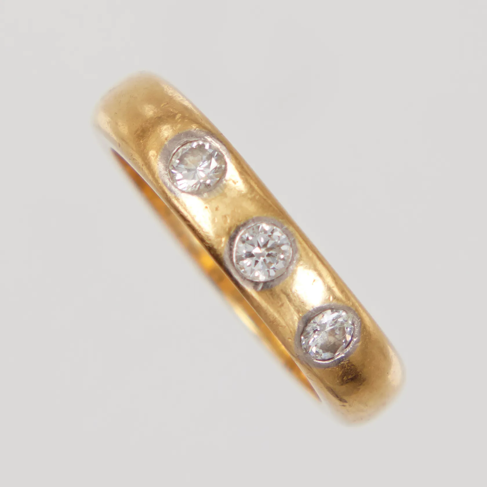 Ring stl 17¼, bredd 4,6mm, diamanter 3x ca 0,10ct, gravyr, 18K Vikt: 8,9 g.
