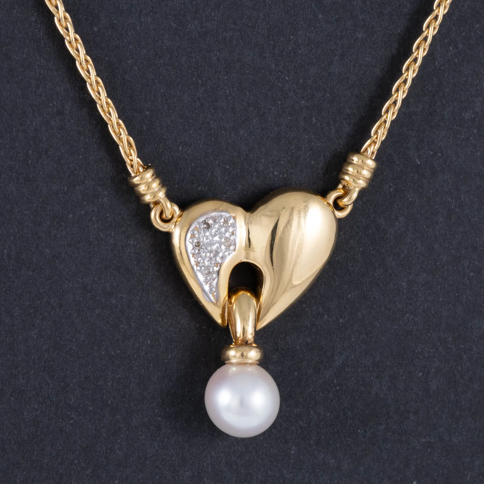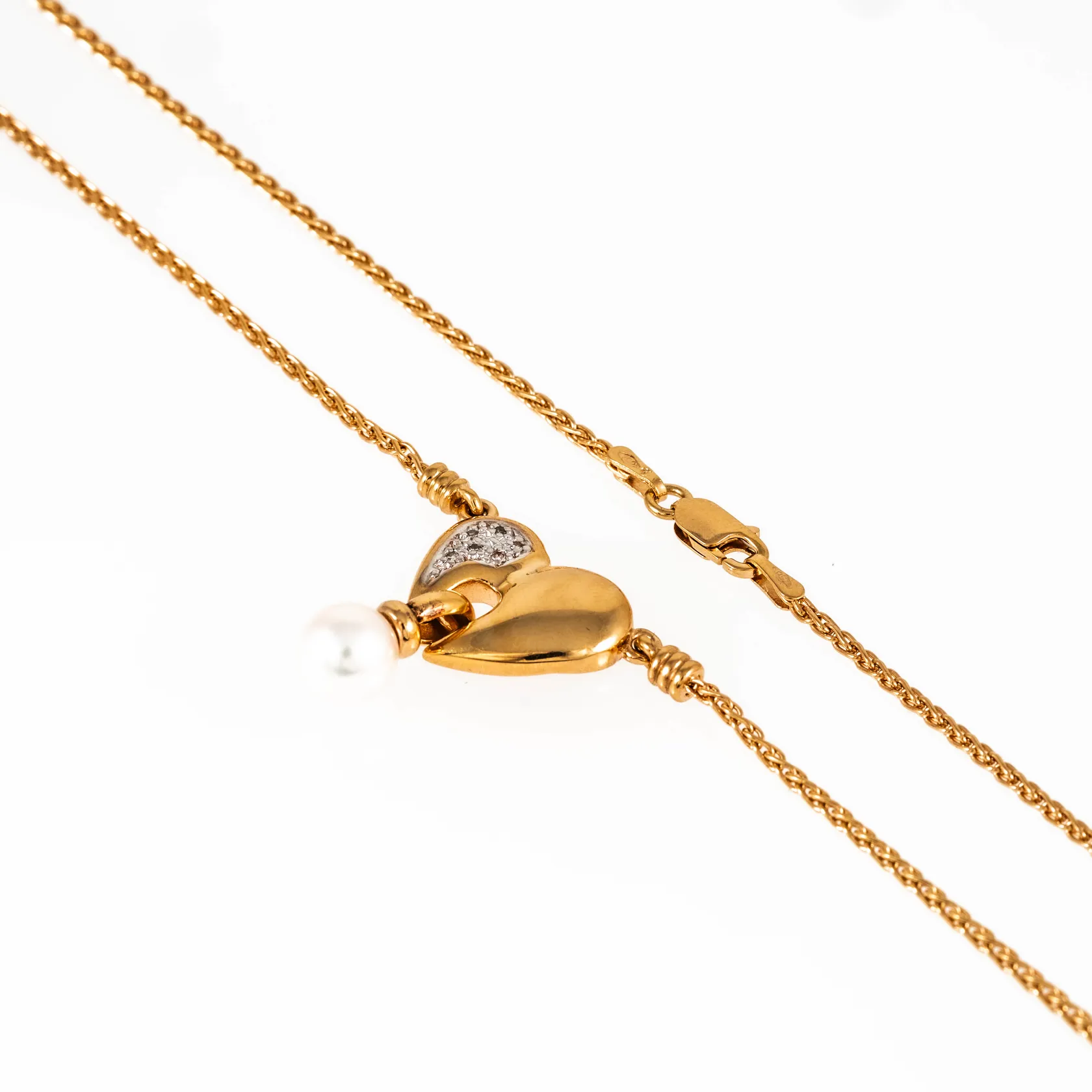 Collier i 18K guld med integrerat hänge hjärta med 5 x c:a 0,01ct 8/8 slipade diamanter och en odlad vit pärla Ø 8 mm. Det är 45 cm långt, kedjans bredd 1,7 mm. Hängets mått 17,5 x 25,5 mm. Vikt: 11,9g. Karbinhake. Vikt: 11,9 g.