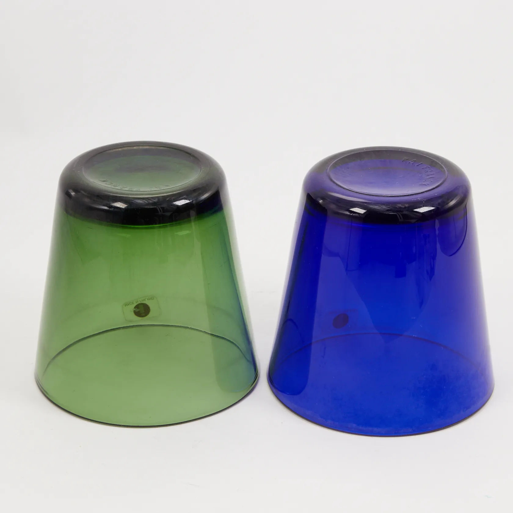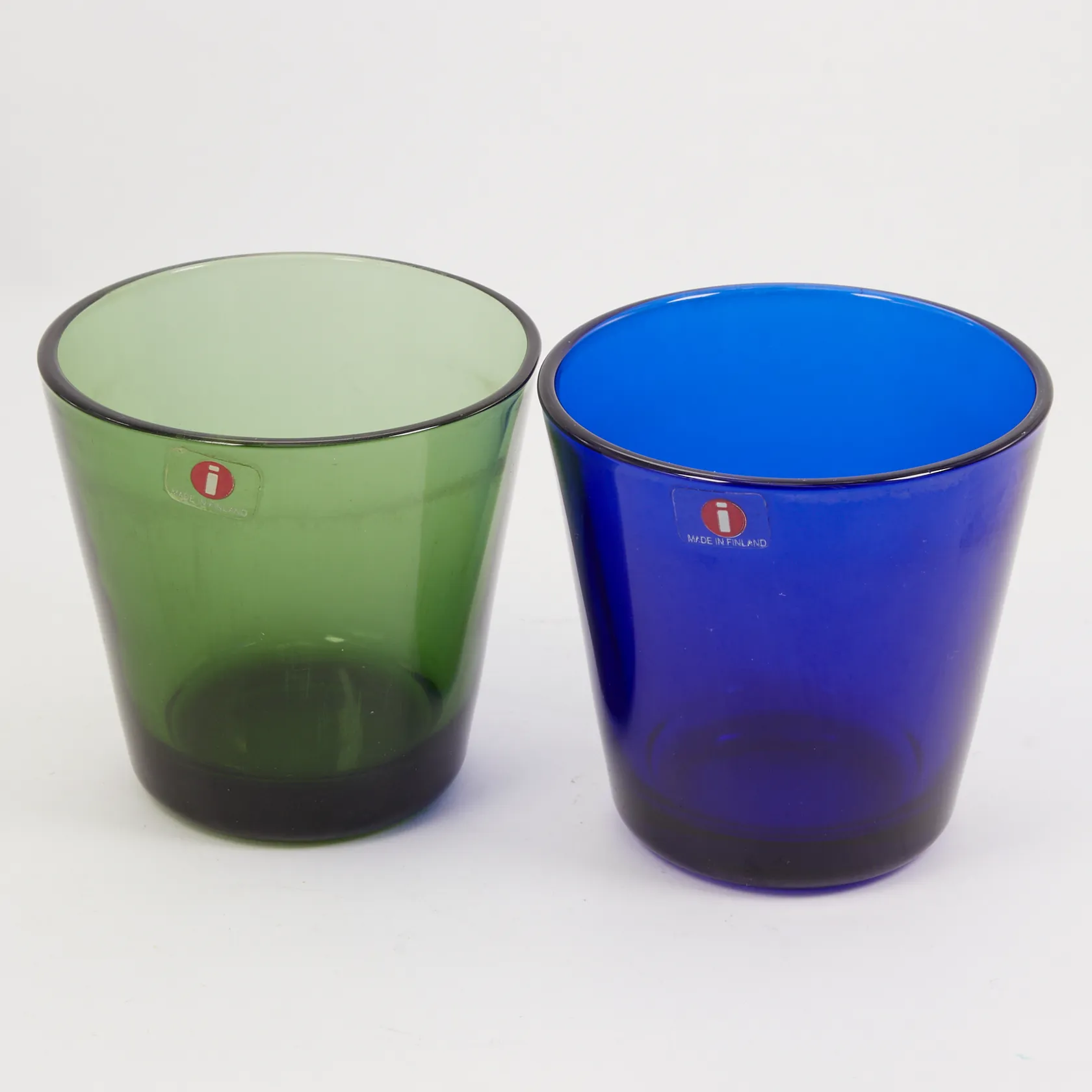 2 Dricksglas Iittala, Kartio, design: Kaj Franck, 21cl, höjd: 8cm, Ø 8cm, grön, blå, repor/slitage Skickas med paket..