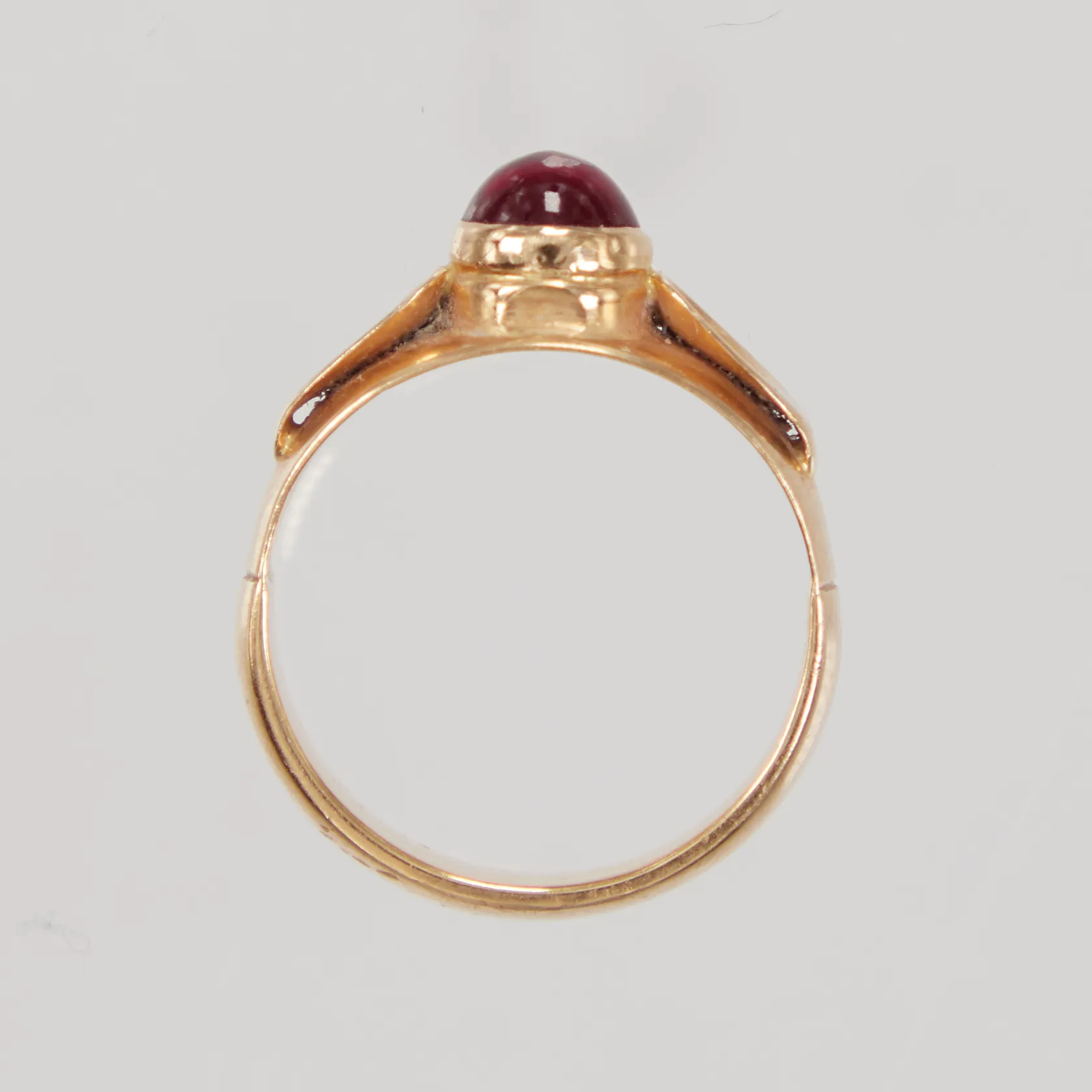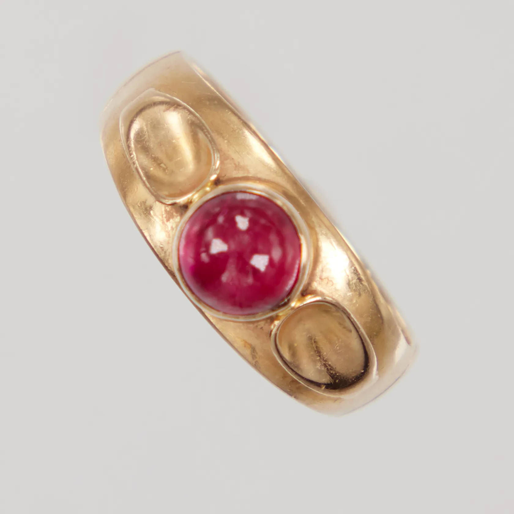 Ring stl 16¾, bredd 5-7mm, röd sten, 18K Vikt: 4,2 g.