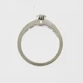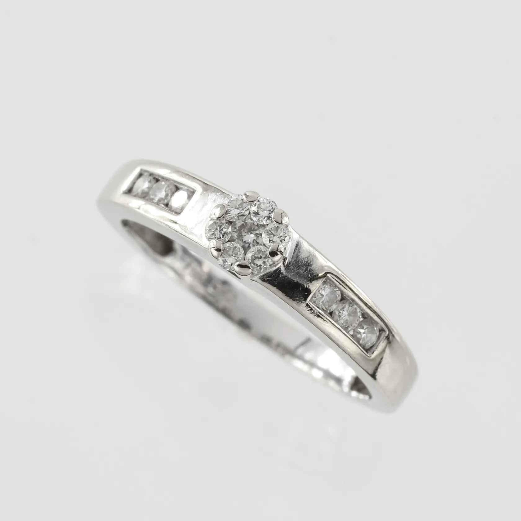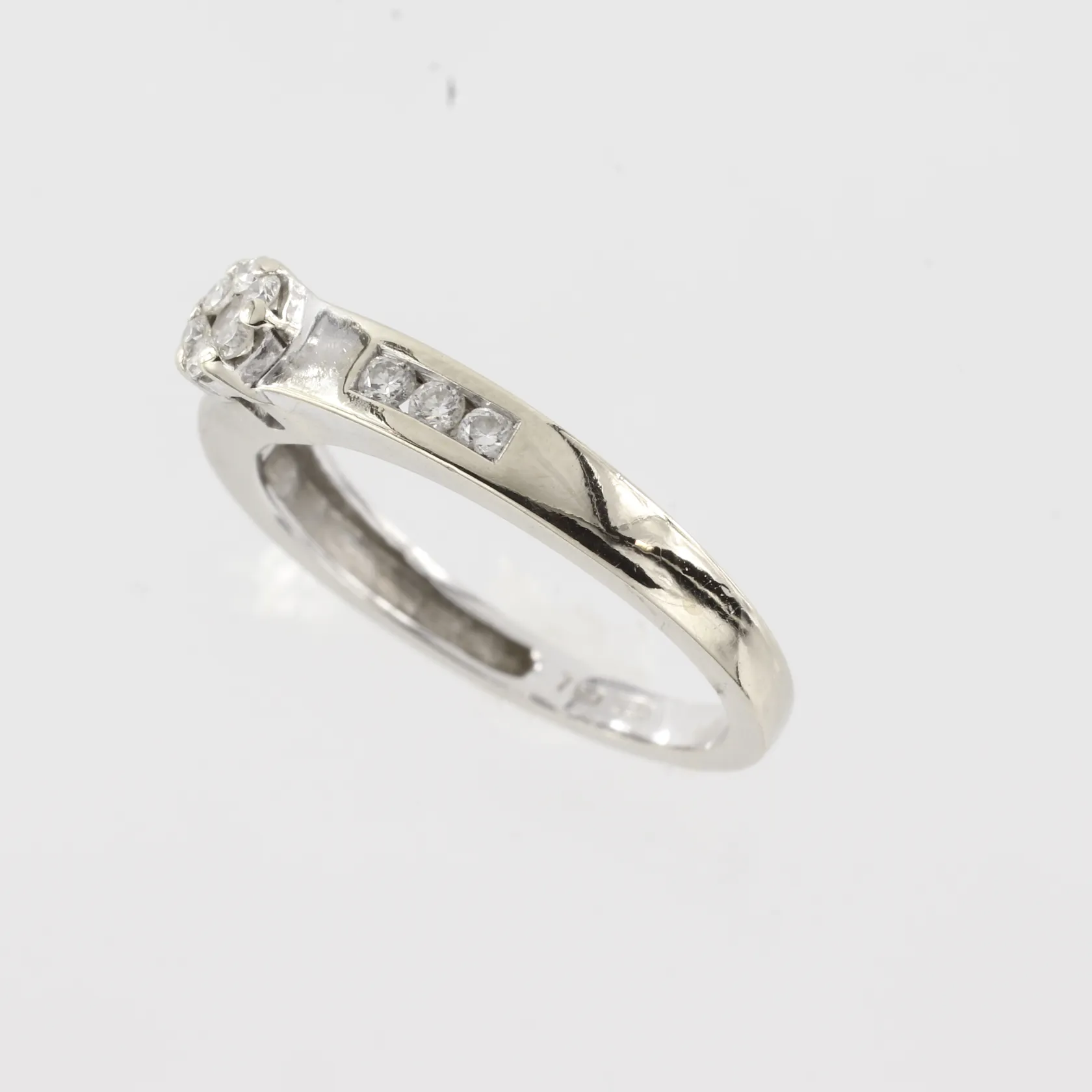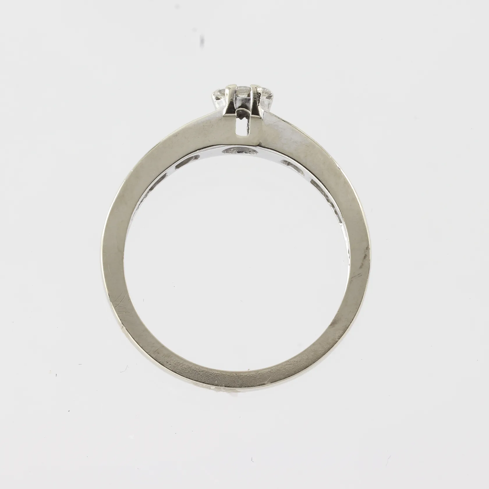 Ring med diamanter ca 7x0,02ct , ca 6x0,015ct, Guldfynd AB, storlek 16 ½ mm, bredd 1.9-4.1 mm, skulle bli finare med en omrodiering, 18 k vitguld Vikt: 3,3 g.