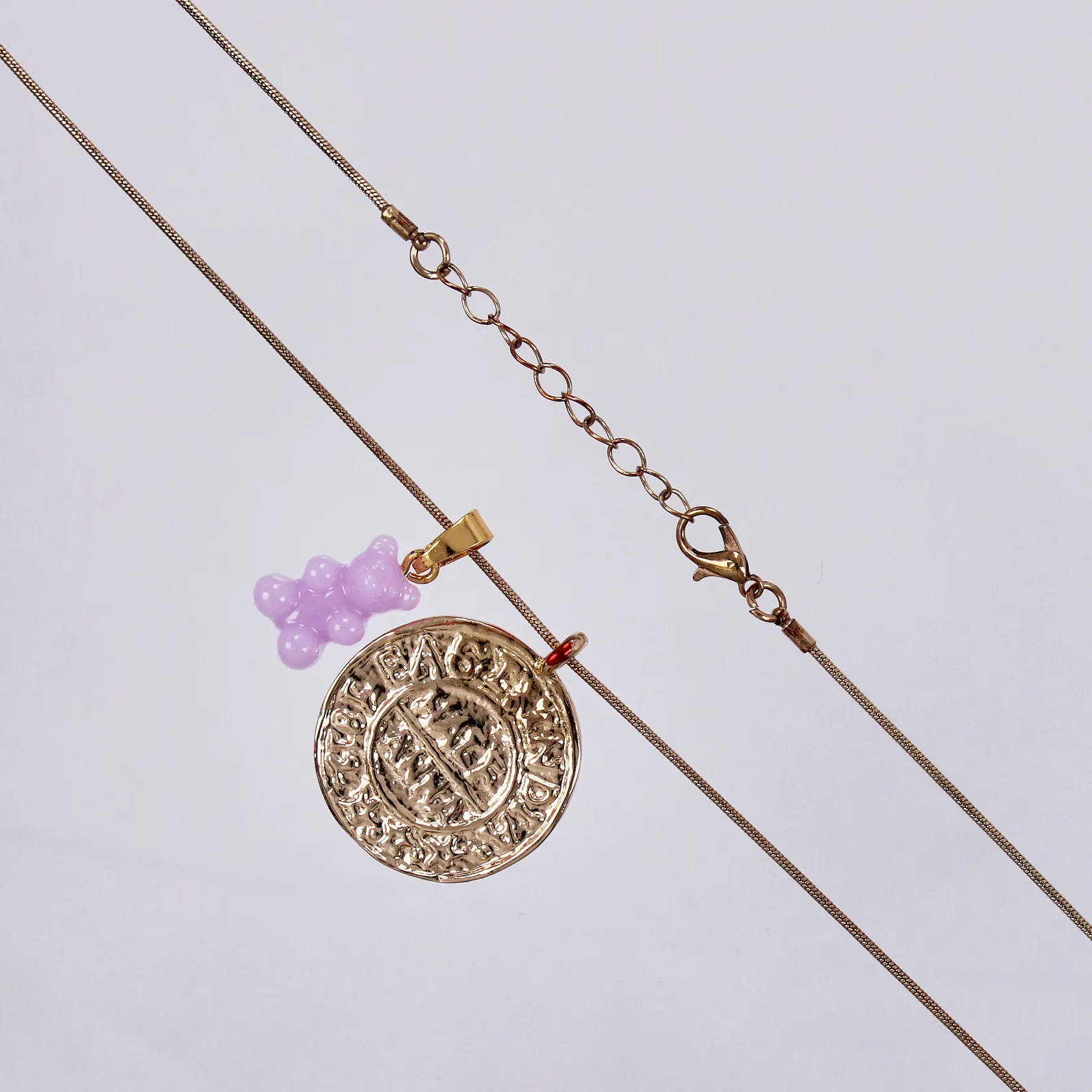 Kedja längd ca 59-63cm, bredd ca 1mm, 1 hänge med detalj i plast längd ca 25mm, 1 hänge Ø 30mm