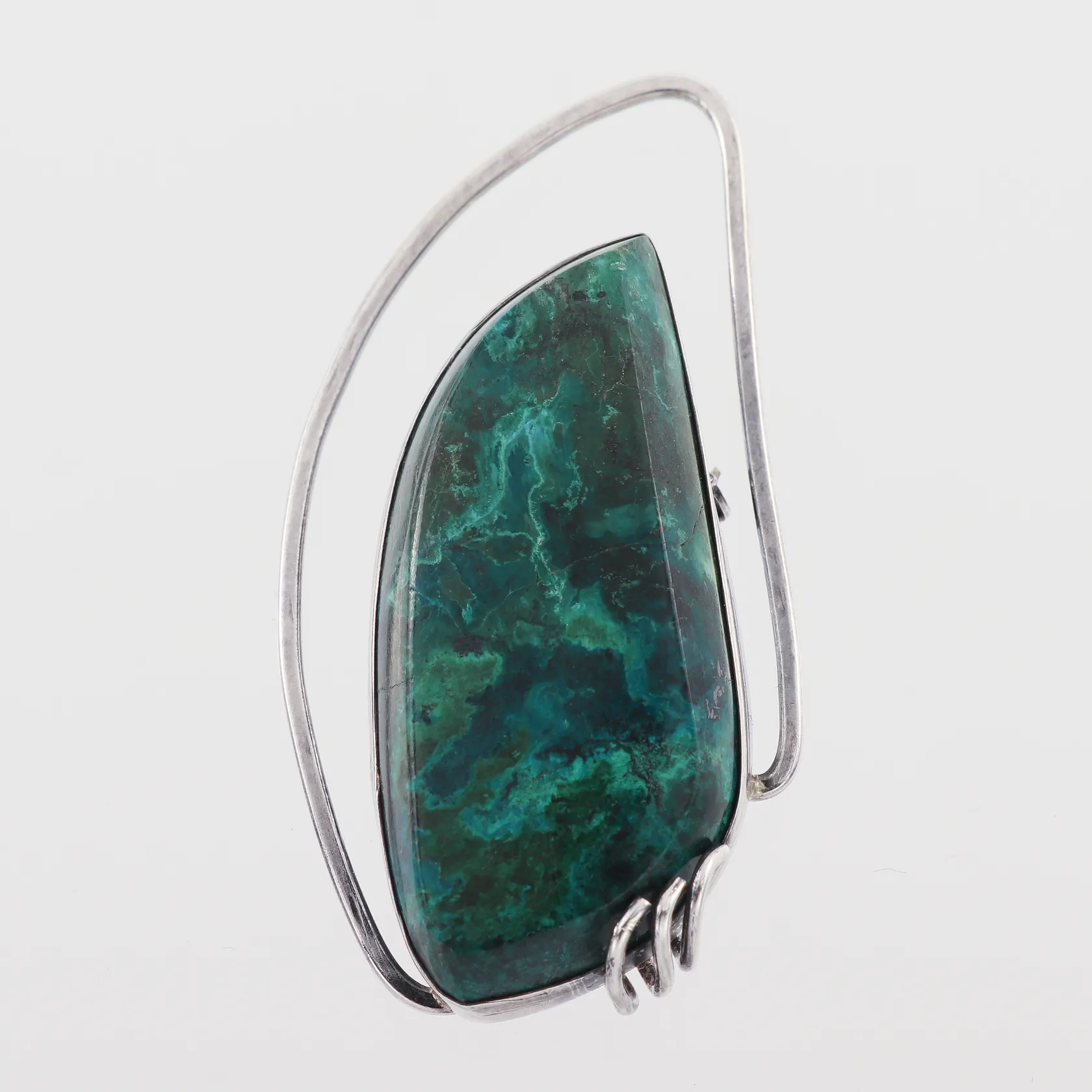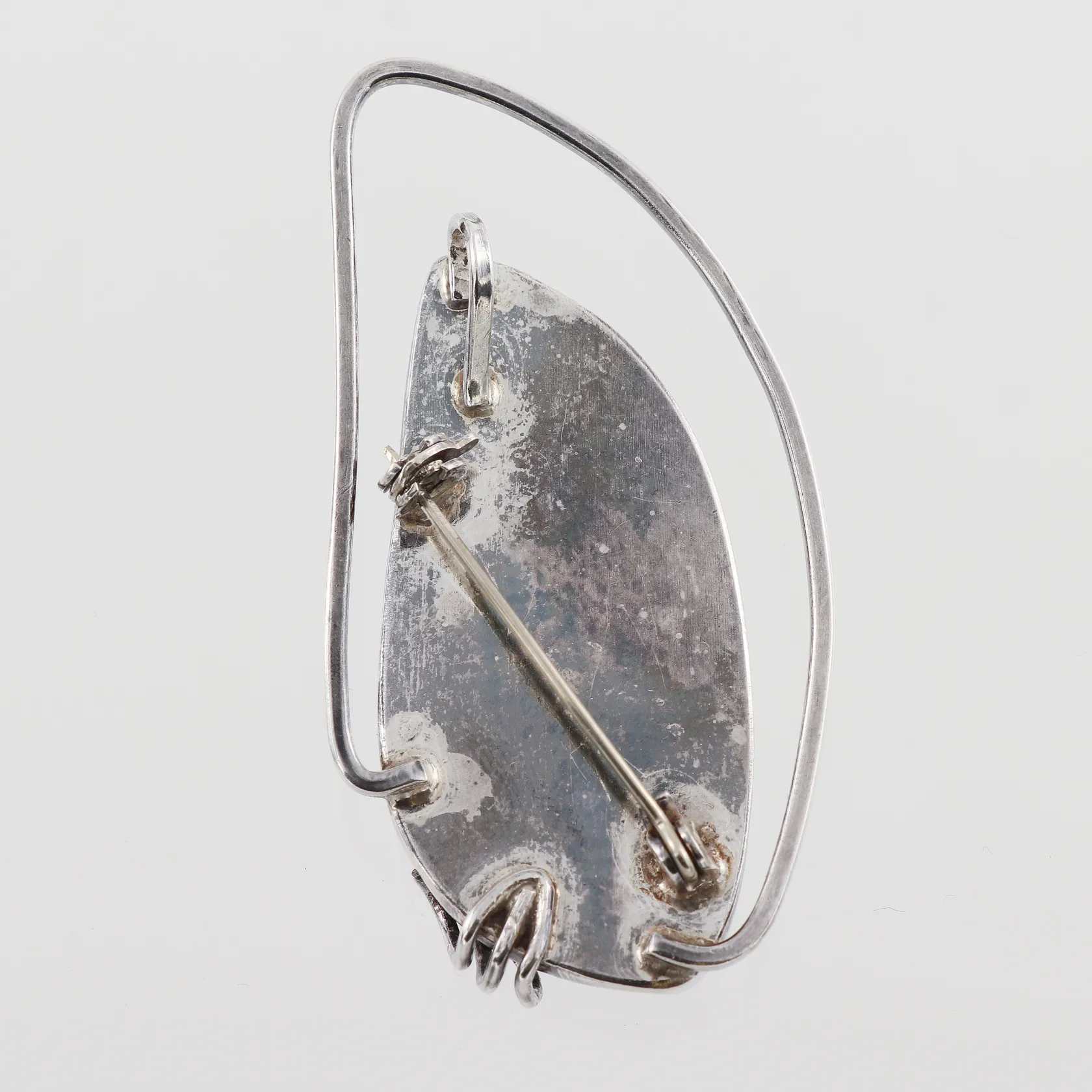 Hänge / Brosch med sten troligtvis malakit, längd 6 cm, silver otydliga stämplar Vikt: 21,4 g.
