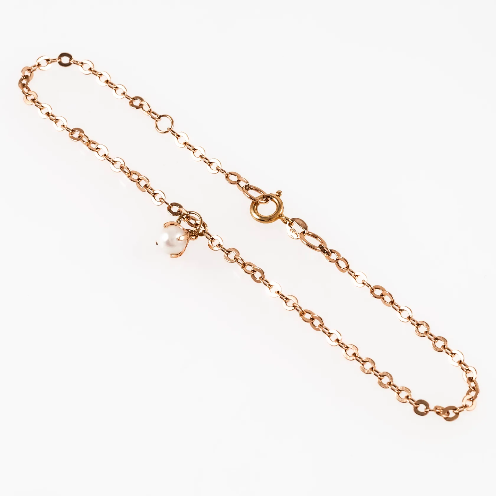 Vristlänk i 14K guld med berlock odlad vit pärla Ø 5 mm. Justerbar i längd 20/22cm, 2,5 mm brett och väger 2,9g. Springring. Vikt: 2,9 g.