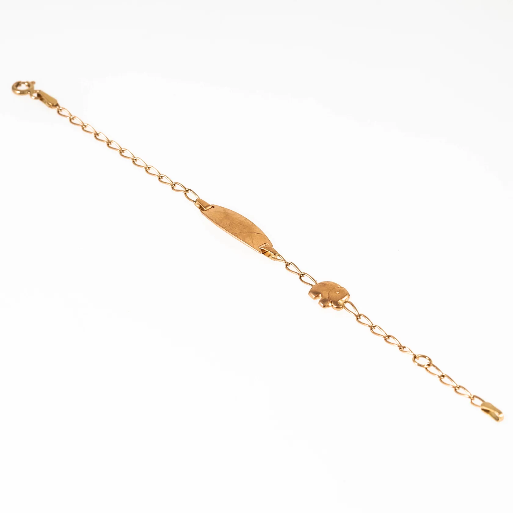 Barnarmband i 18K guld med gravyrbricka och elefant. Det är 12,5/14,5 cm långt, 2 - 6 mm brett och väger 3,0g. Springring. Vikt: 3 g.