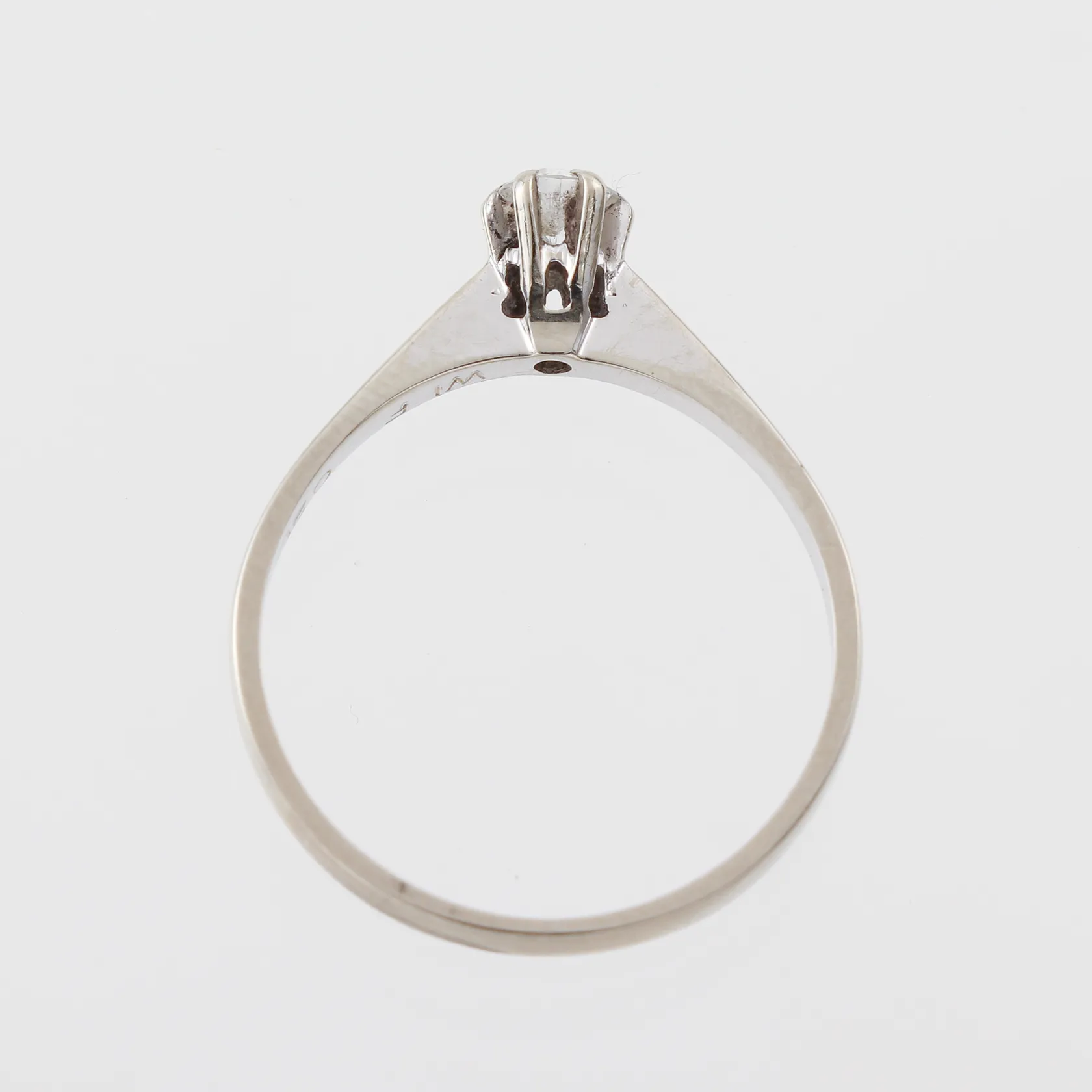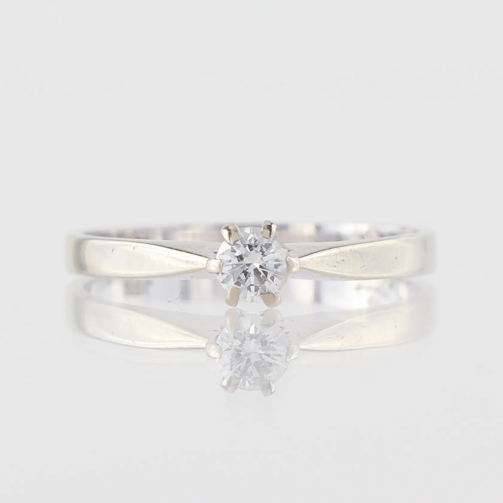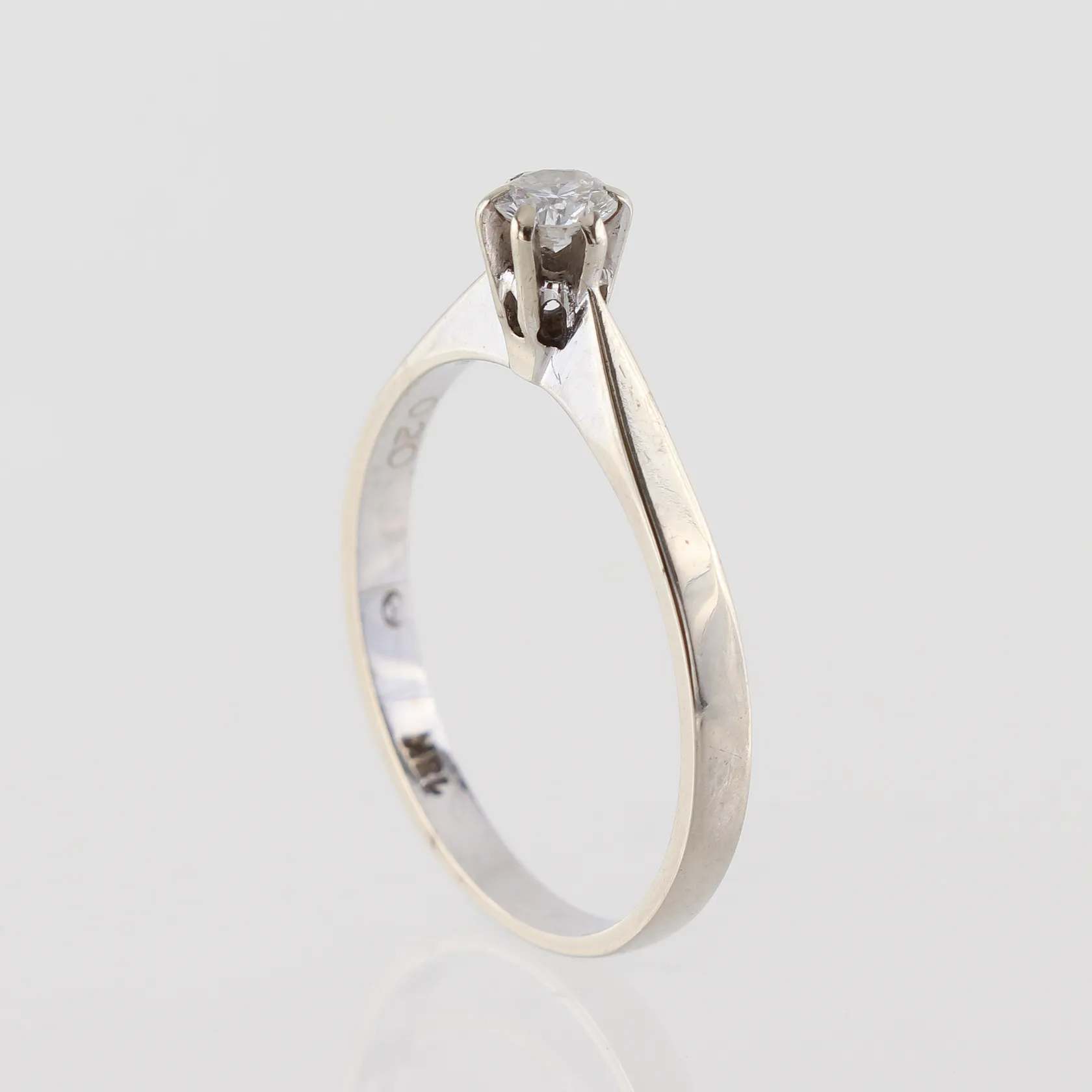 Ring vitguld med solitär diamant på 0.20 ct WIF enligt inskription, storlek 17 ¼ mm, bredd 2-4.6 mm, 18 k. Vikt: 2,1 g.
