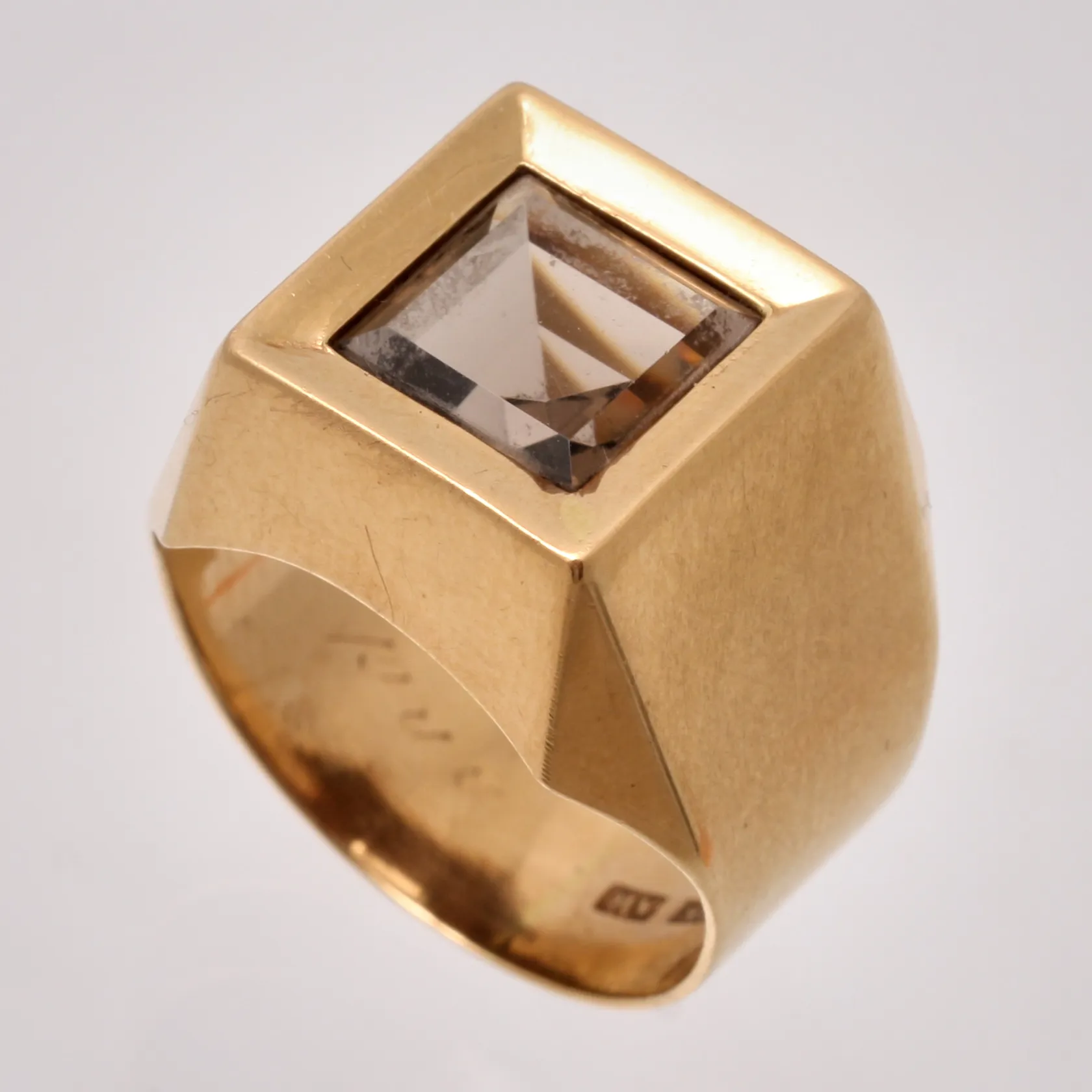 Klackring i 18K guld, stl 18½, 1st rökfärgad sten, mått 9x9mm, tillverkad av D Ekström Aktiebolag, år 1975, bruttovikt 7,44g, ca nettovikt 6g. Vikt: 7,4 g.