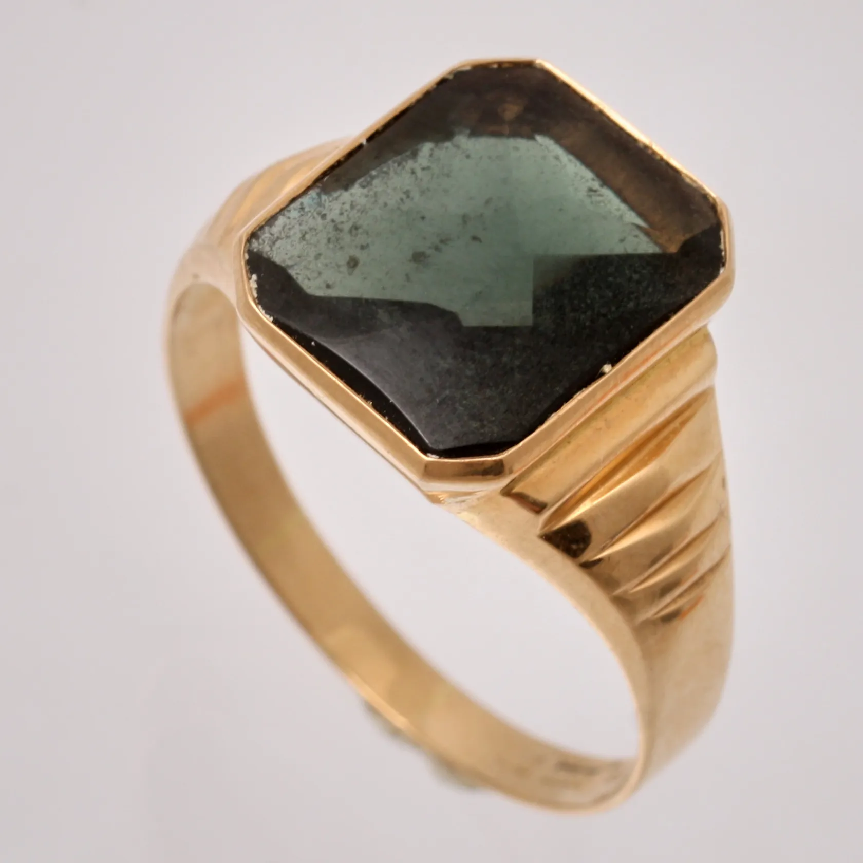 Klackring i 18K guld, stl 22, bredd 2,7-14,6mm, 1st grön sten, mått 11,5x14mm, tillverkad av D Ekström Aktiebolag, år 1966, bruttovikt 4,68g, ca nettovikt 3g.. Vikt: 3 g.