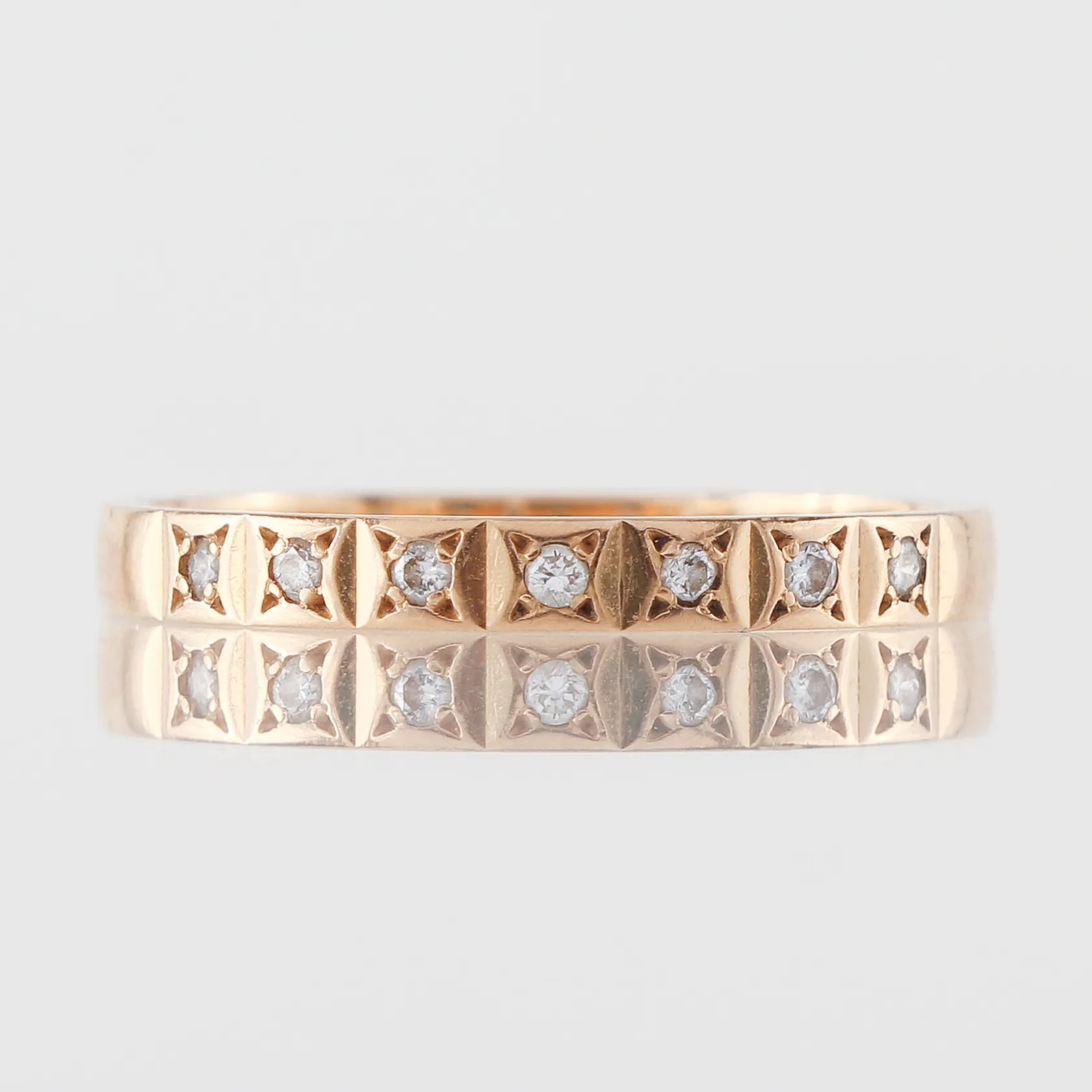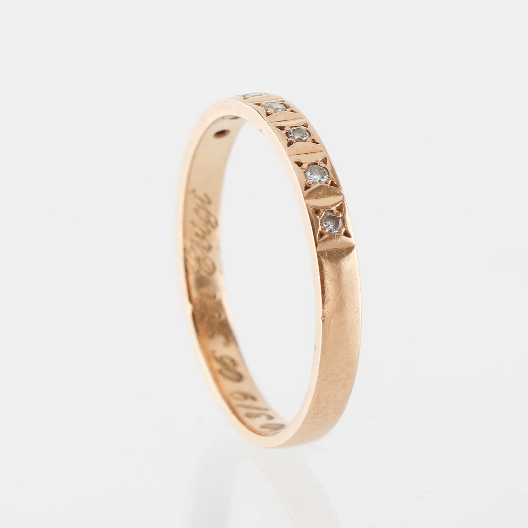 Ring med 7 st små diamanter, Flemming Uziel AB, gravyr, storlek 17 mm, bredd 2.4 mm, 18k. Vikt: 2 g.