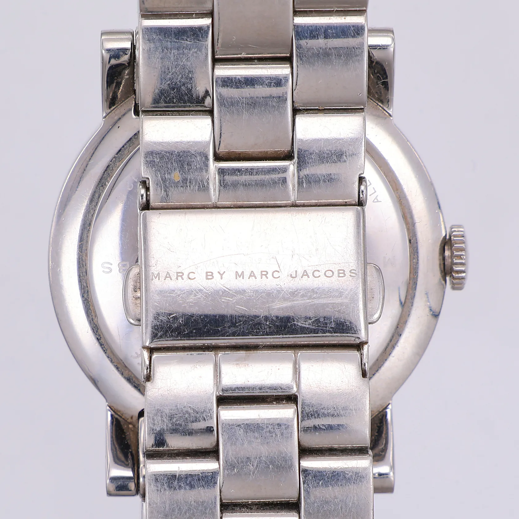 Damur Marc by Marc Jacobs, quartz, stål, vit urtavla med vita stenar, Ø36mm, MBM3054, serienr 111211, länkar, viklås, ca 18,5cm, stål, står still, inga tillbehör