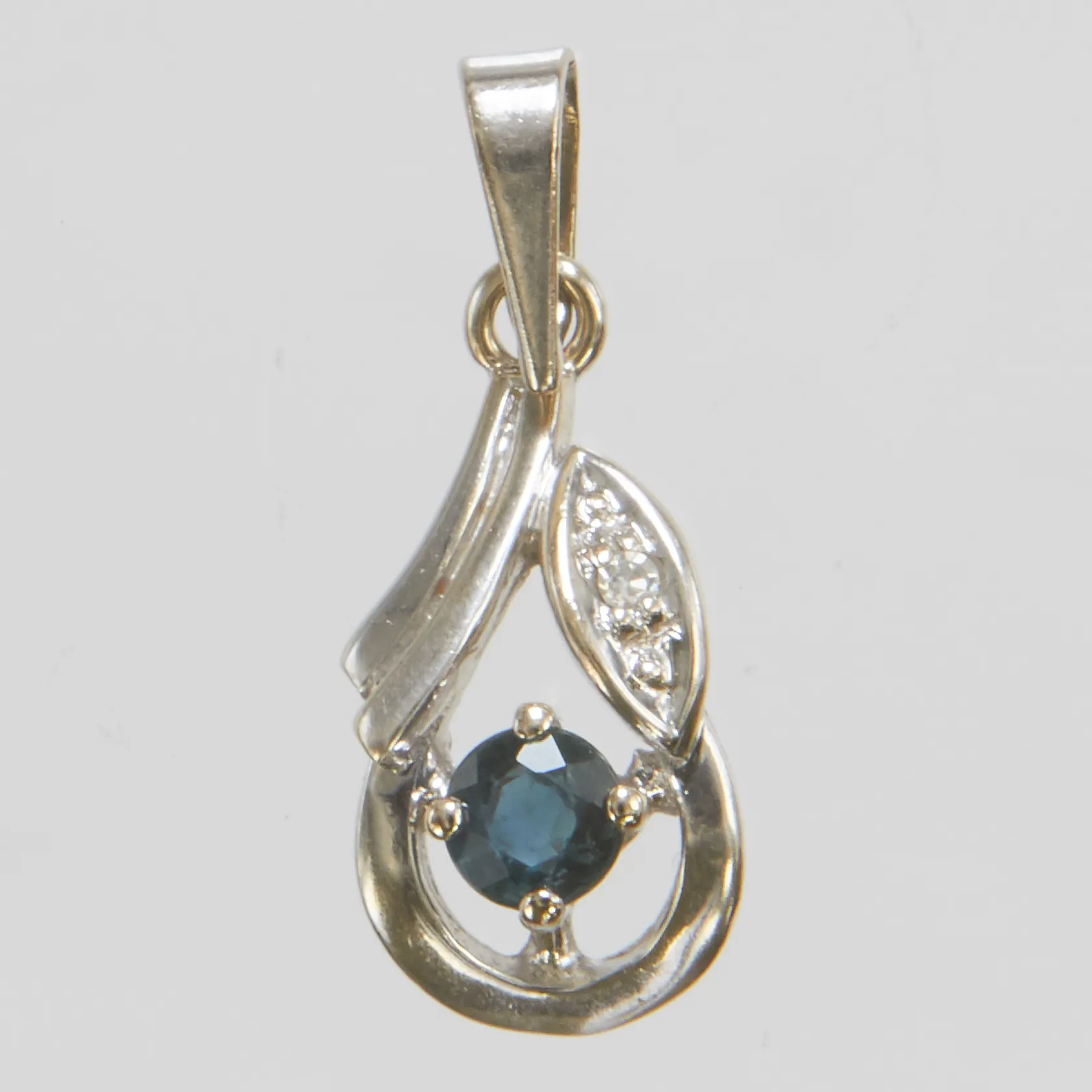 Hänge, safir, åttkantslipad diamant 1 x ca 0,005ct, längd ca 20mm, bredd 7,5mm, importstämplad, vitguld, 18K Vikt: 1,5 g.