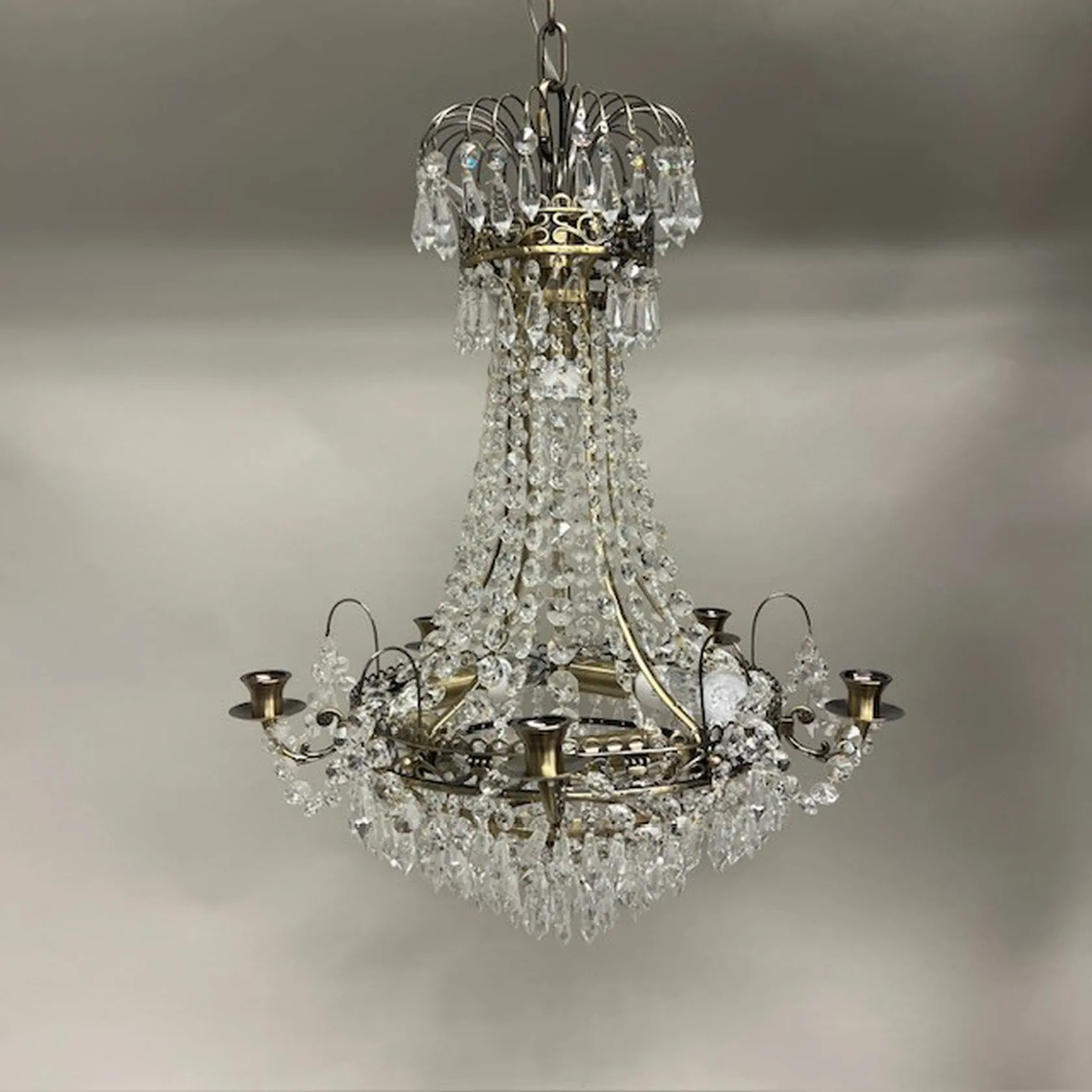 Ljuskrona Läckö Markslöjd, höjd 58cm, bredd 48cm, sex lampor, kristall, kartong OBS! SKICKAS EJ Specialfrakt, kontakta pantbankskontoret för mer information..