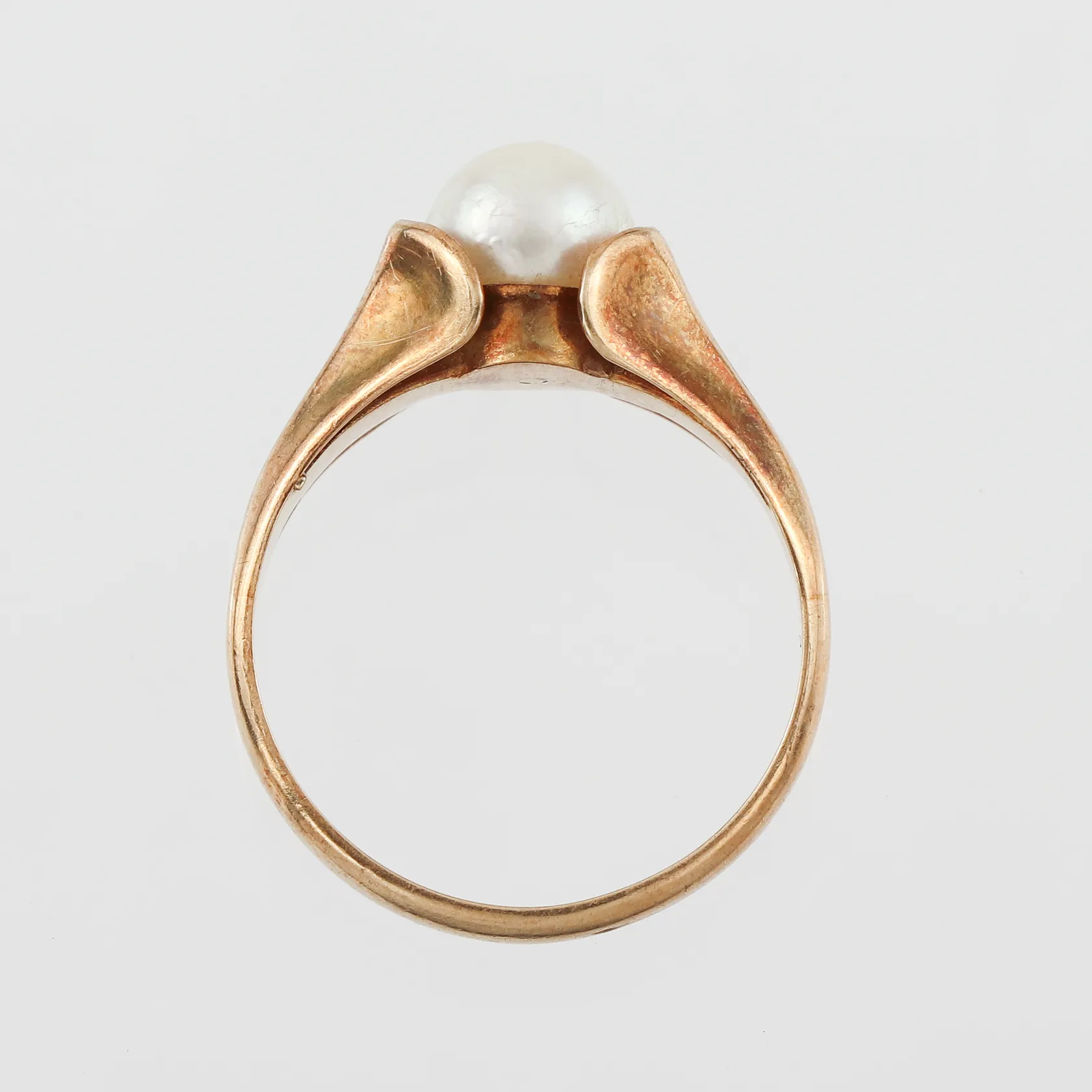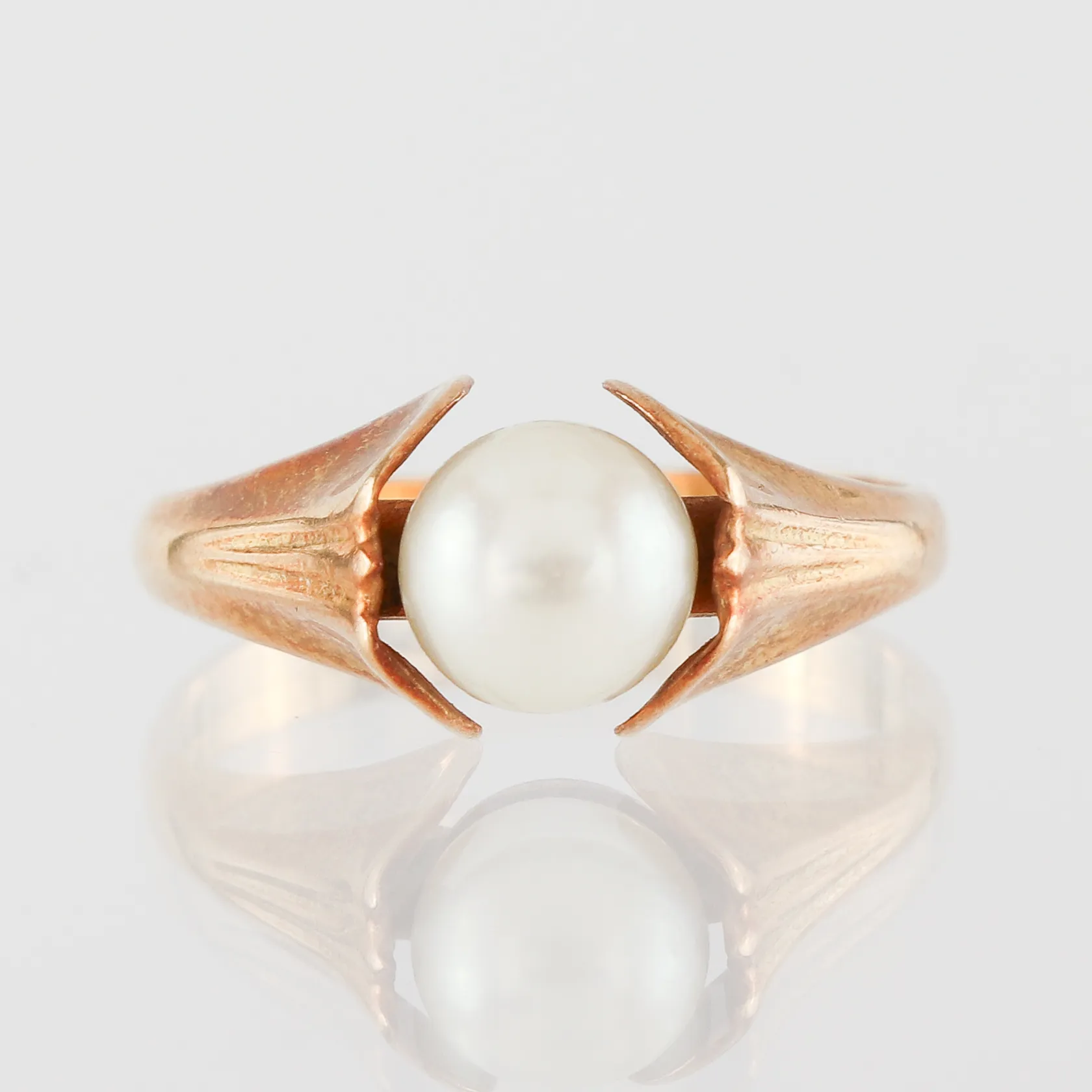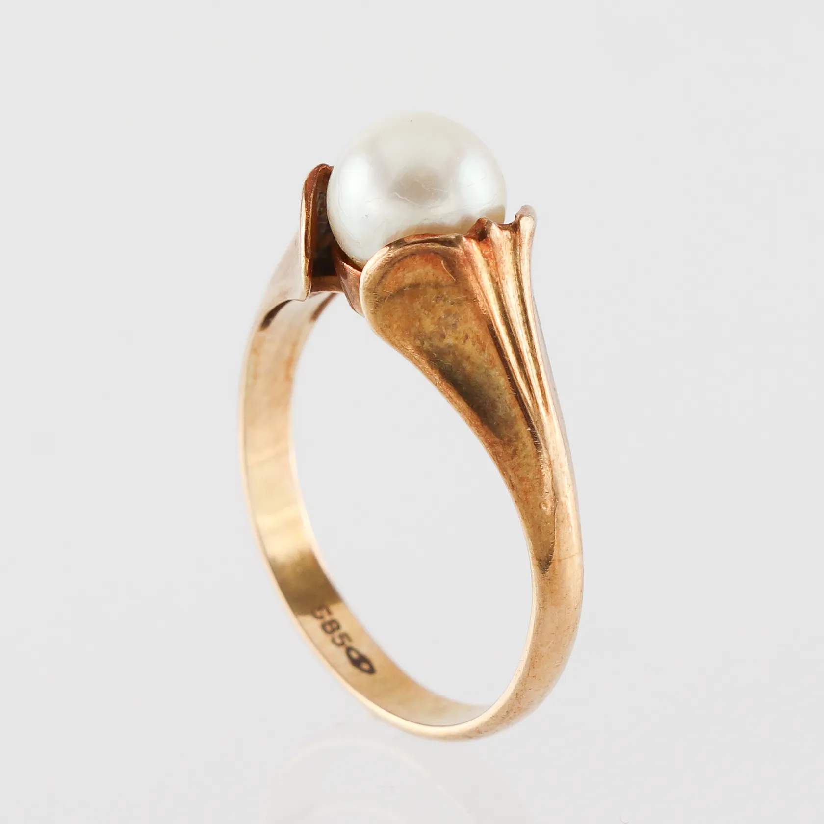 Ring med odlad pärla, storlek 17 ½ mm, bredd 2.5-8.5 mm, 14k. Vikt: 3,3 g.
