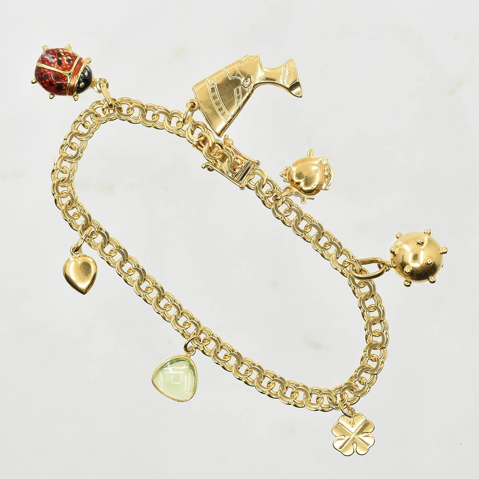 Armband Bismarck med 7 berlocker, längd 18 cm, bredd 5 mm, 18K. Vikt: 17,7 g.