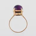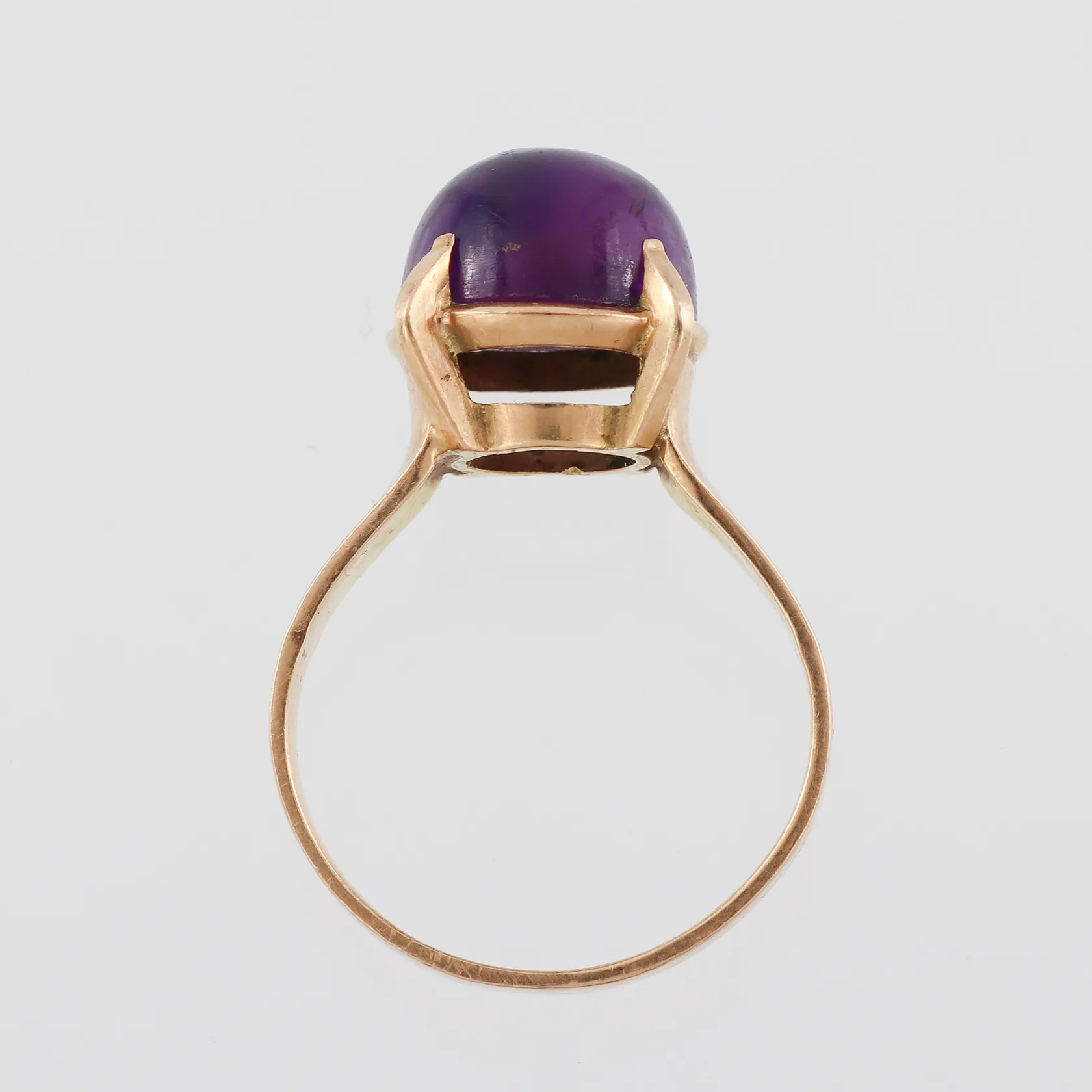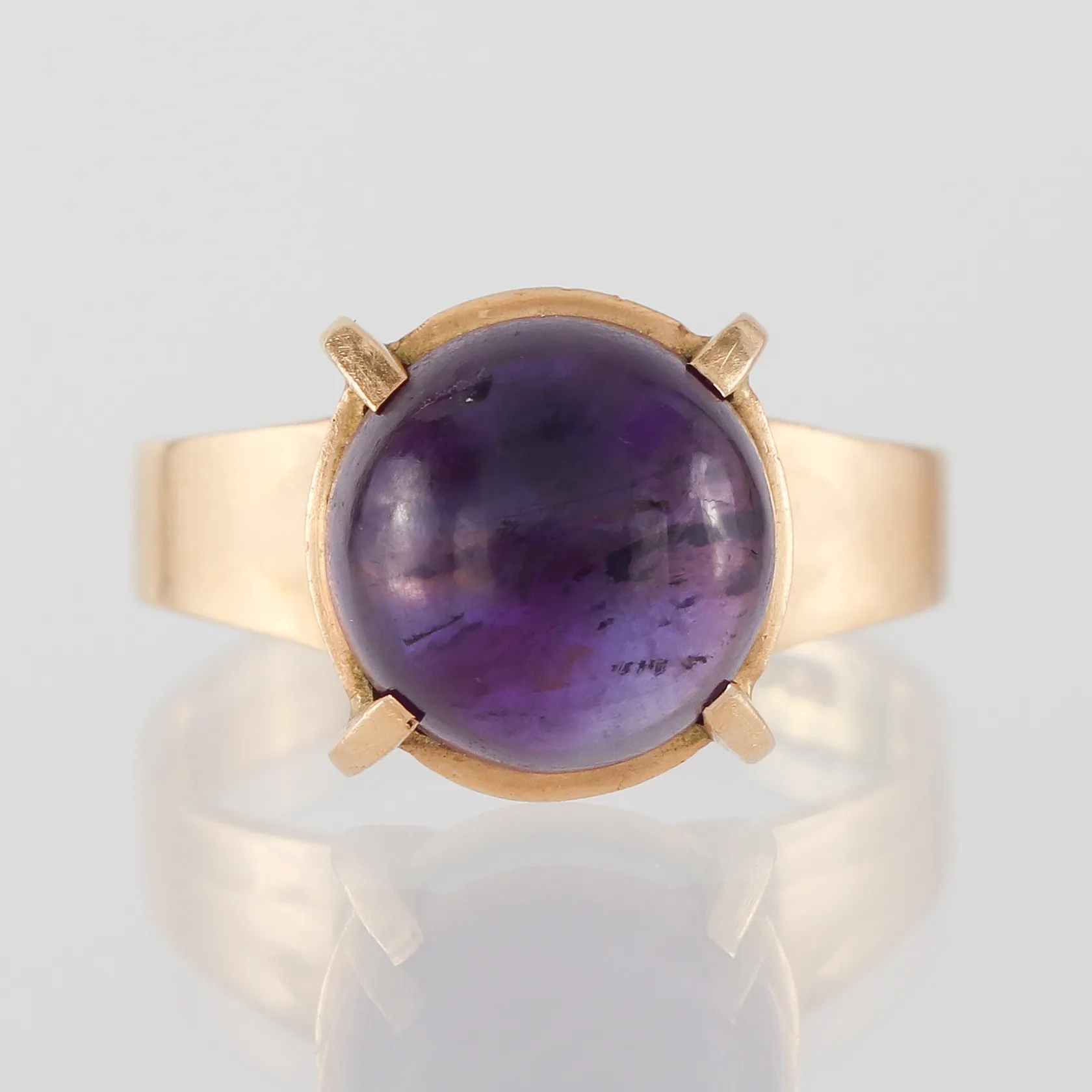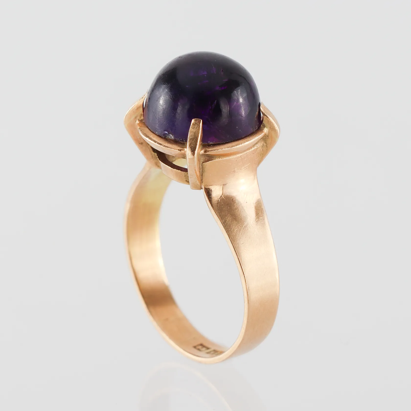 Ring med cabochonslipad lila sten något skavmärke och något rörlig, Kaplan Stockholm 1967, storlek 18 ¼ mm, bredd 3.6-12 mm, 18k. Vikt: 6,3 g.