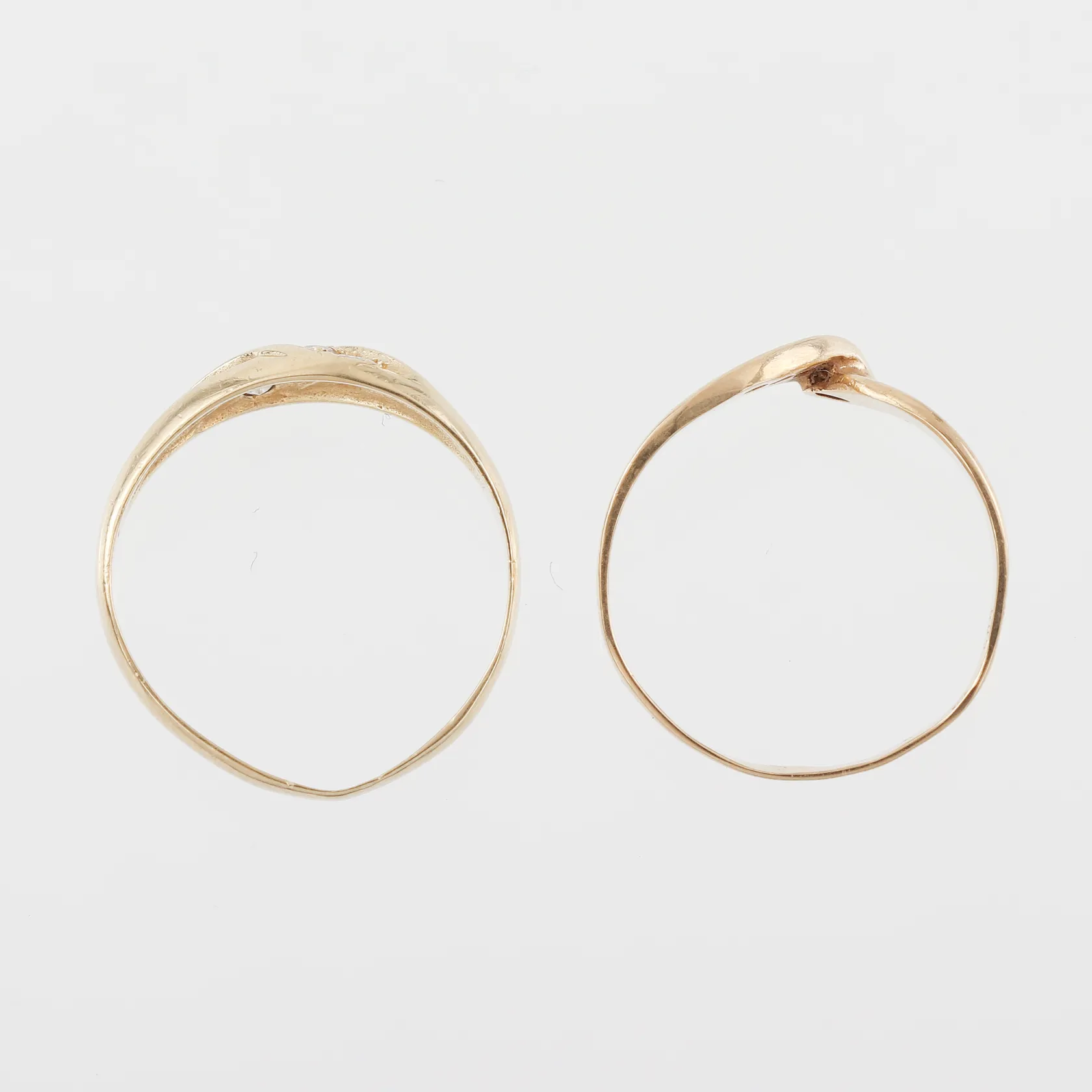 Ringar 2 st med stenar, ojämn form, storlek 17 ¼ mm och 18 ¼ mm, 14k. Vikt: 3,1 g.