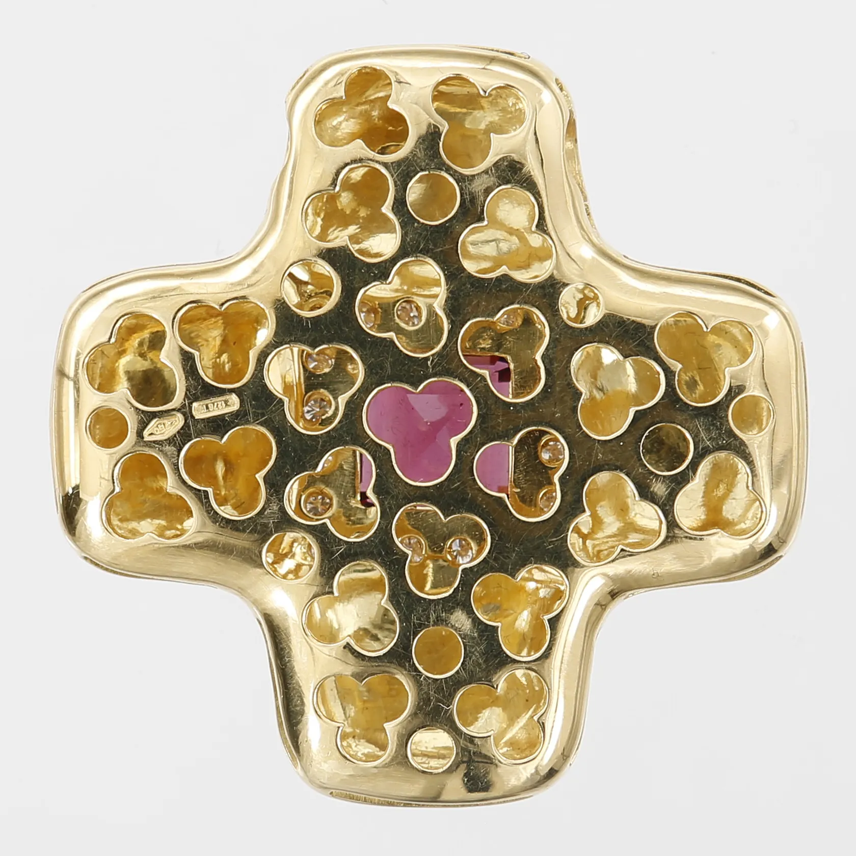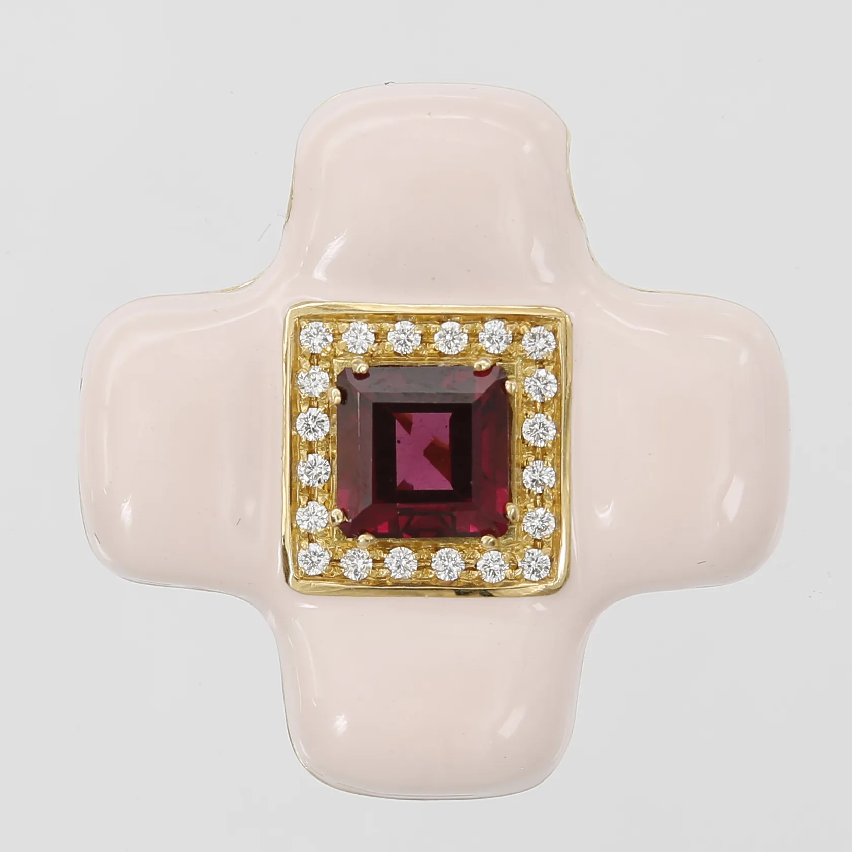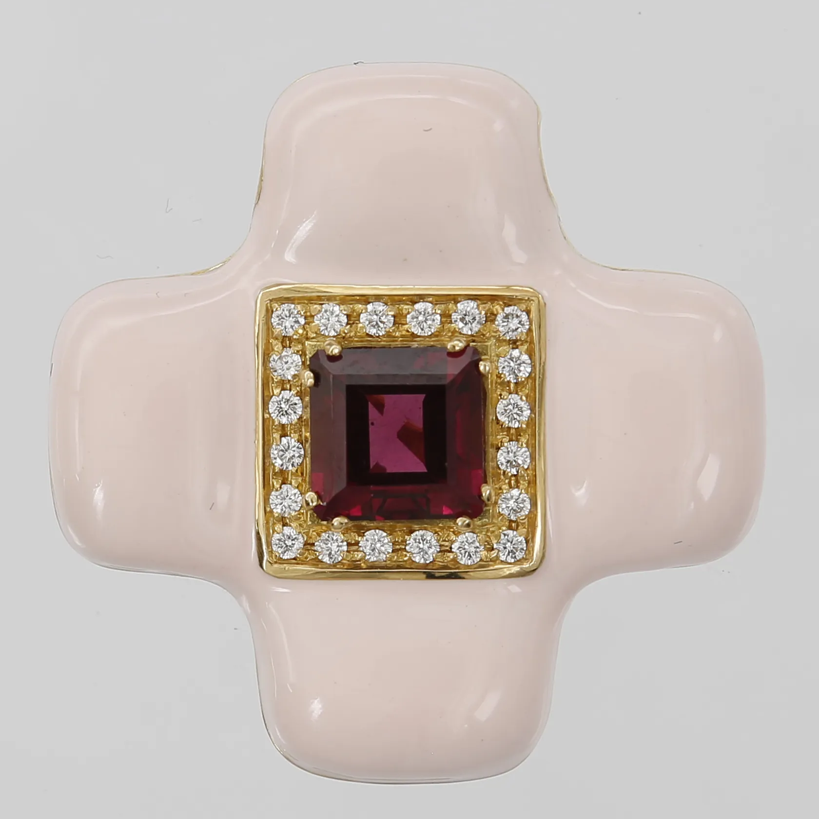 Hänge med rodolitgranat ca 3,30ct, briljantslipade diamanter 20 x ca 0,02ct, samt rosa emalj, italienska stämplar, mått 34 x 34mm, 18K guld Vikt: 16,5 g.