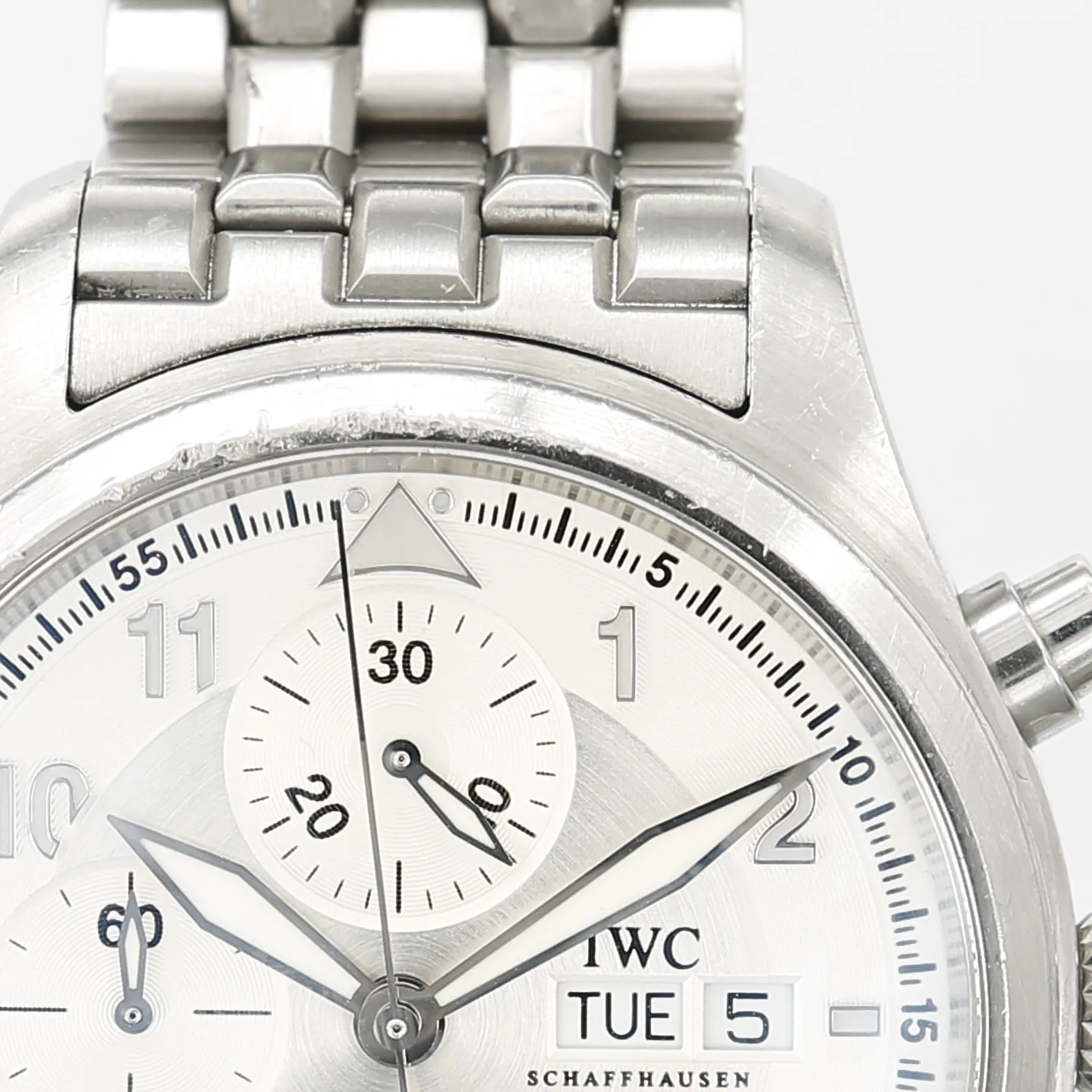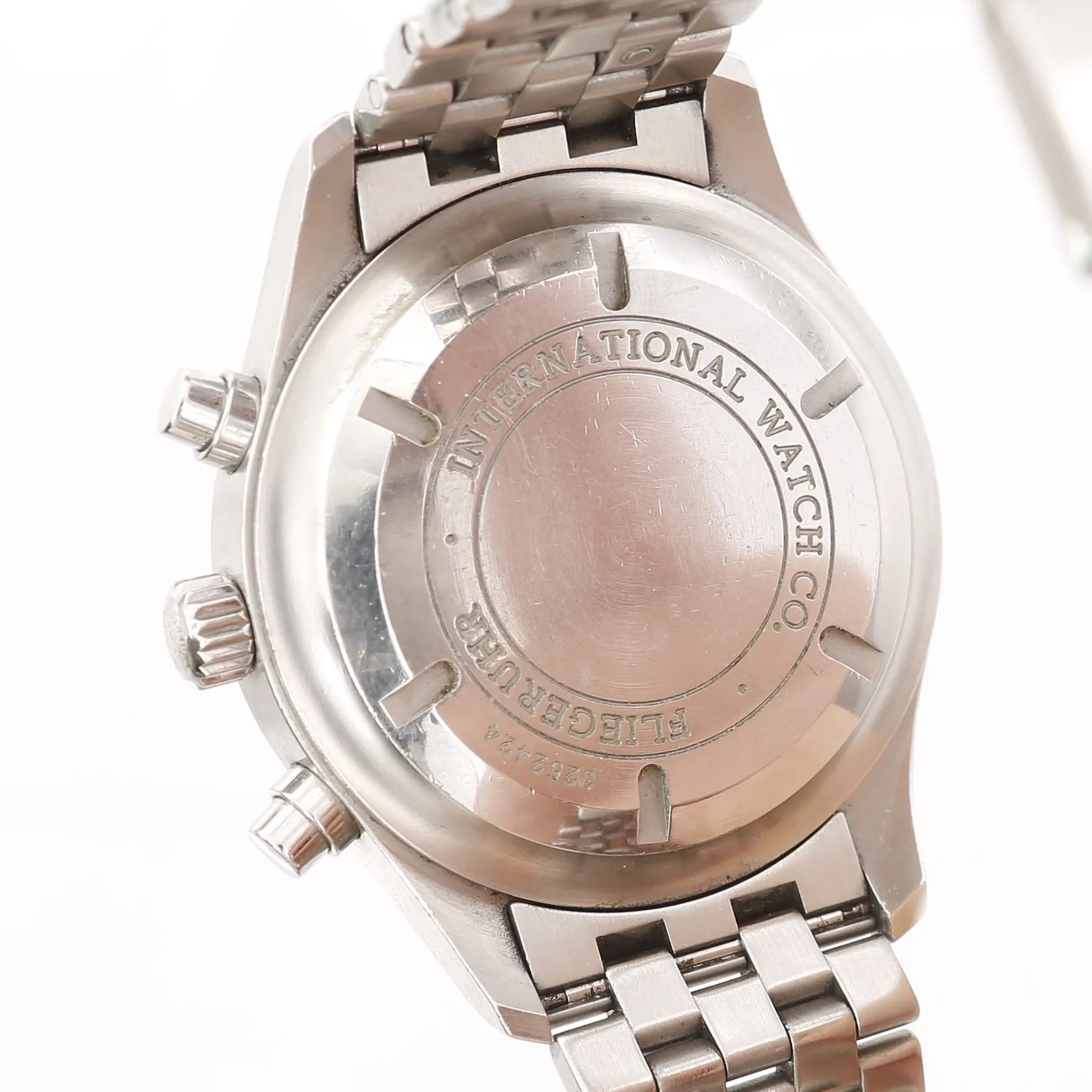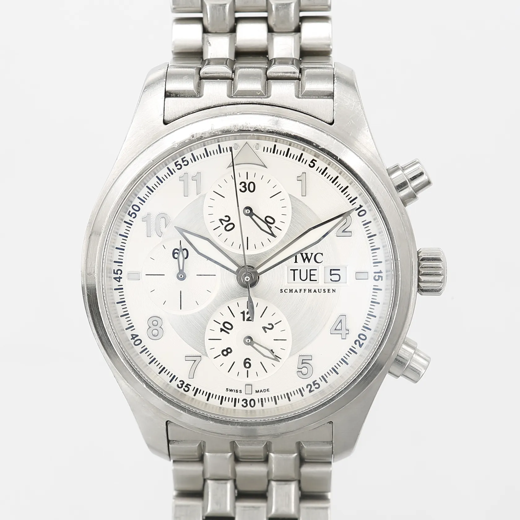 Herrur IWC, Schaffhausen, Spitfire, Fliegerchronograph, stål, automatisk, Ø44mm, referensnummer 371702, serienummer 3252424, kvitto från NK Juvelsalong 2007, slitage, repor, boettring med märken, inga tillbehör.