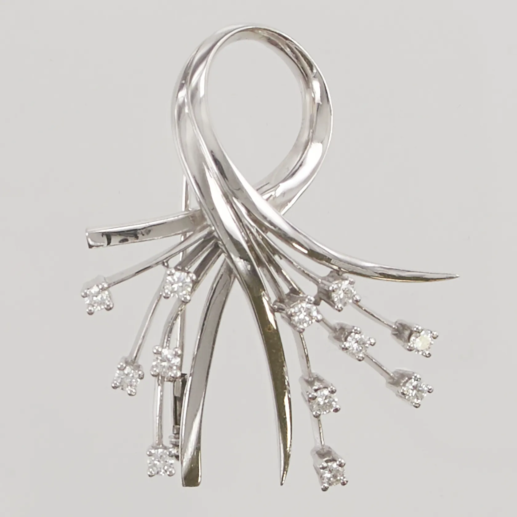 Brosch med diamanter 12 x ca. 0,04-0,05ct, 45x35mm, importstämplad, vitguld, 18K, 14,8g. Vikt: 14,8 g.