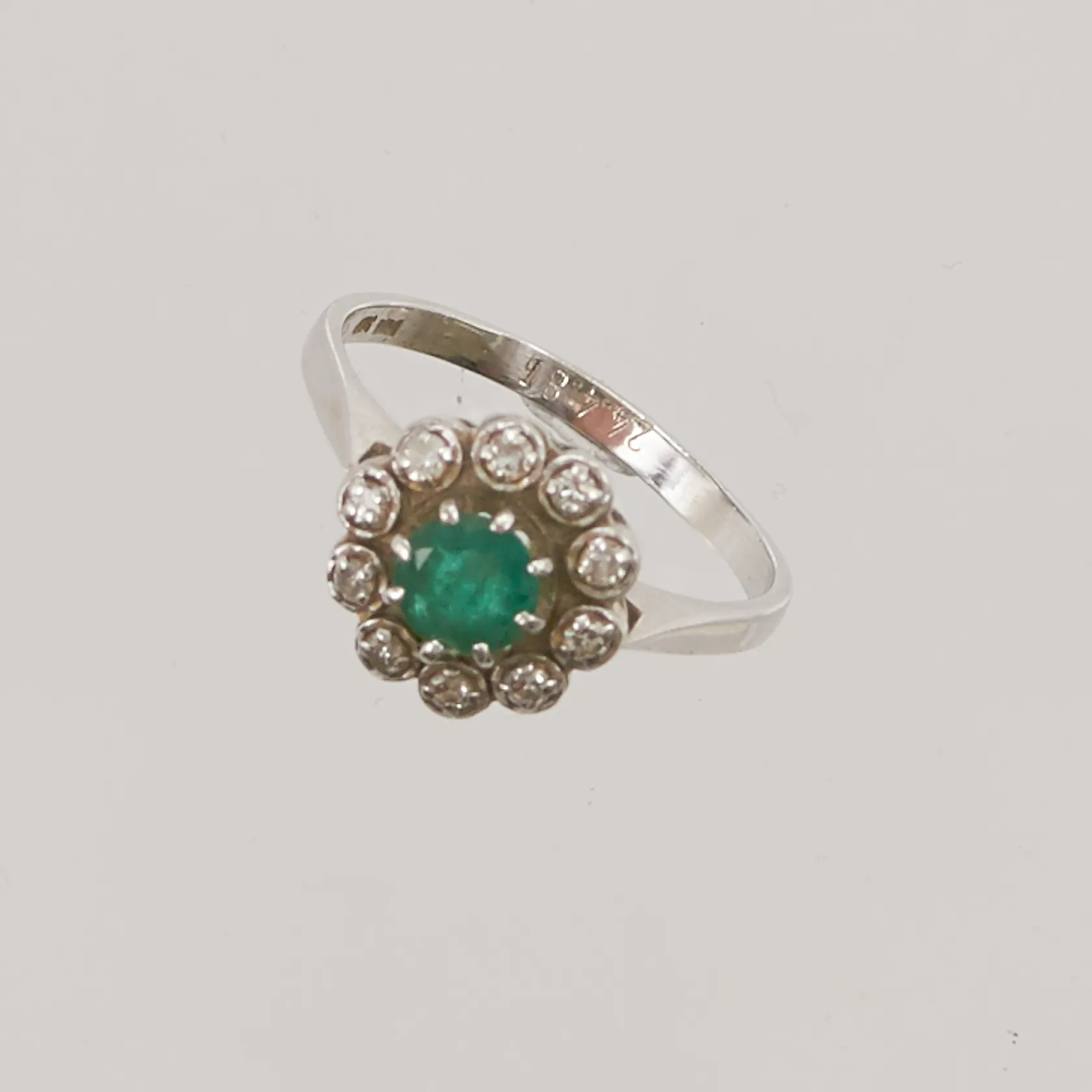 Ring med smaragd samt diamanter 10 x ca. 0,01ct, Ø18, bredd: 2-11mm, gravyr, vitguld, 18K, 3,3g. Vikt: 3,3 g.
