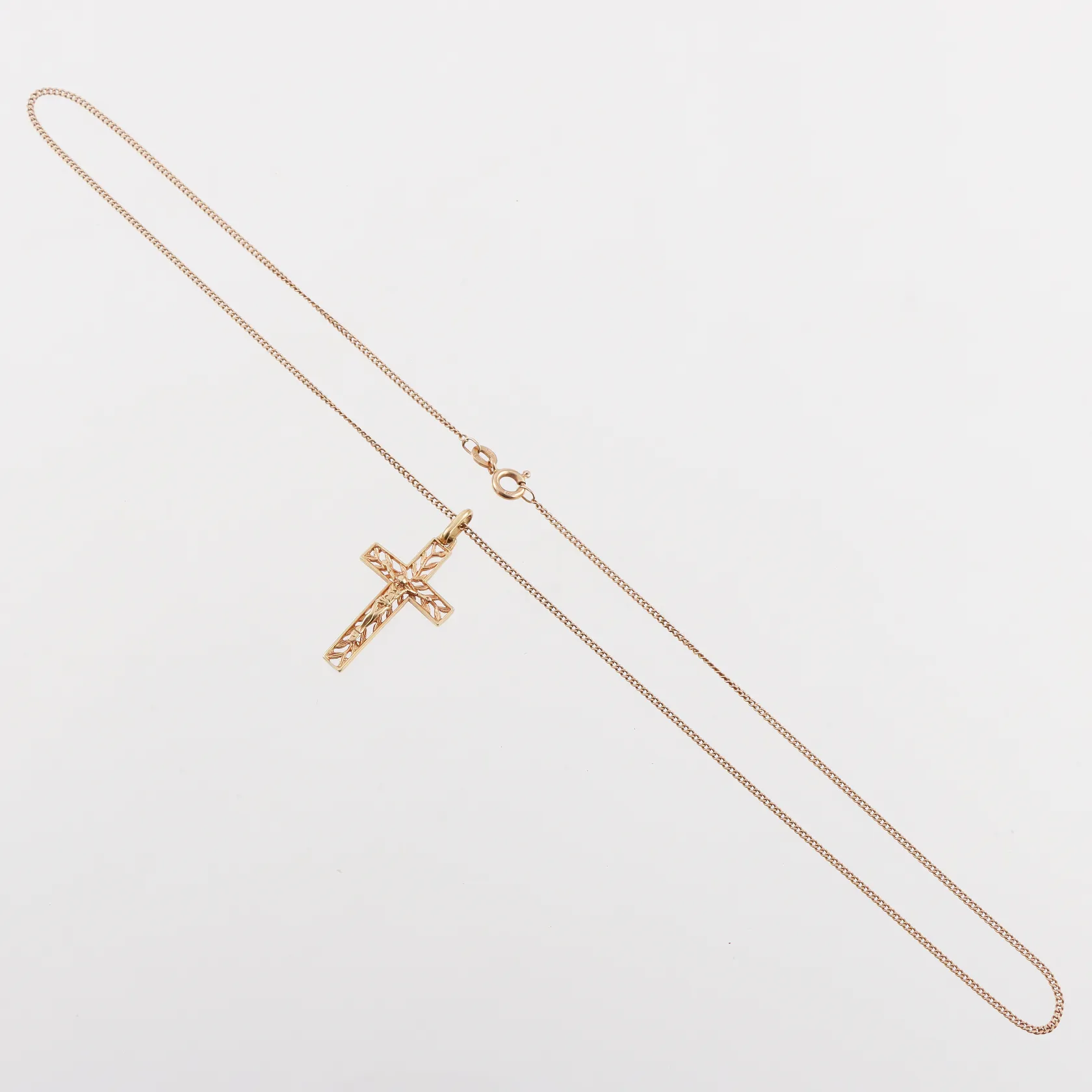 Halssmycke med kors 18k , längd kedja pansar 46 cm, hängets höjd ca 29 mm Vikt: 5,7 g.
