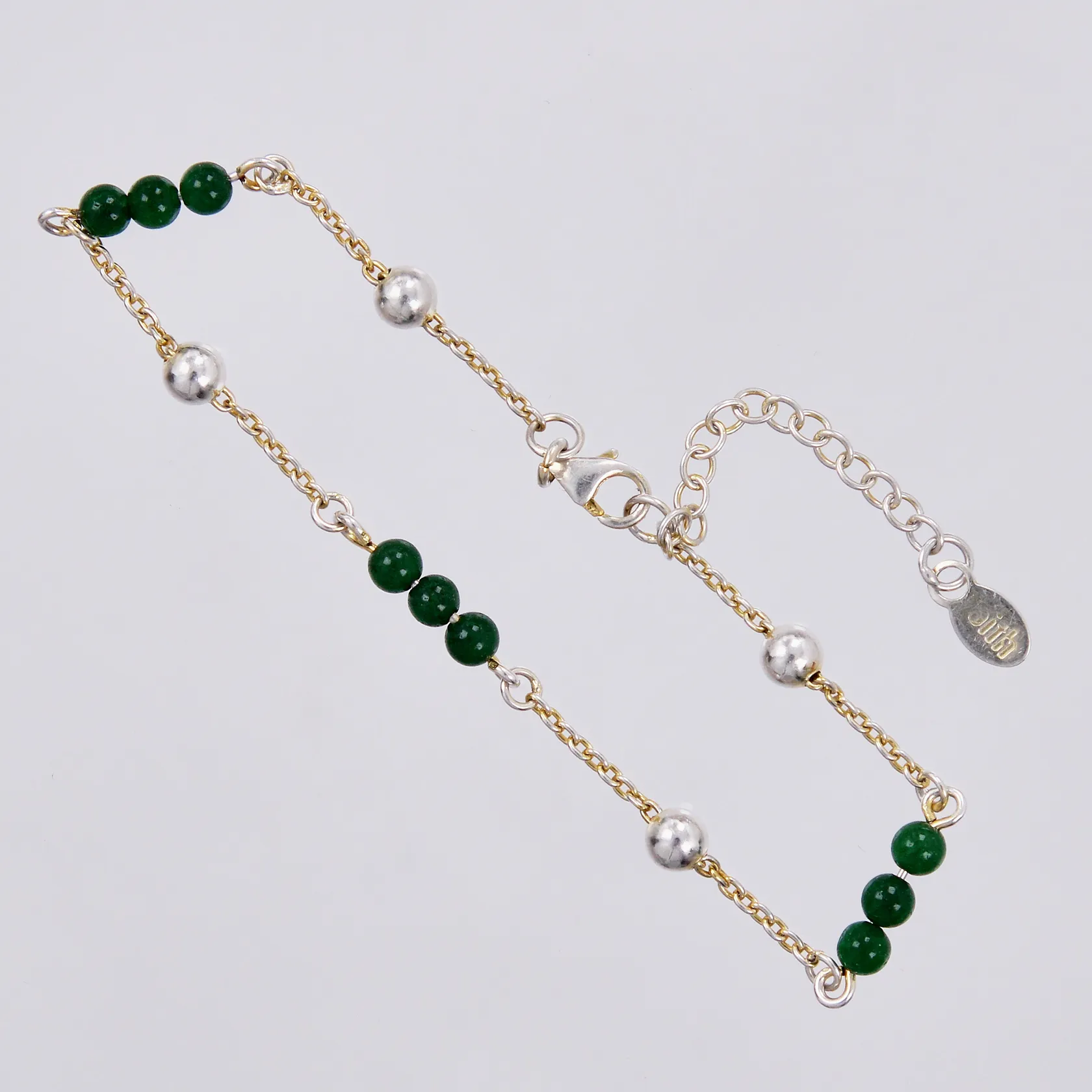 Armband med gröna sten längd: ca 16-19cm bredd: ca 1,5-4mm, delvis förgylld, 925/1000 silver Vikt: 2,5 g.