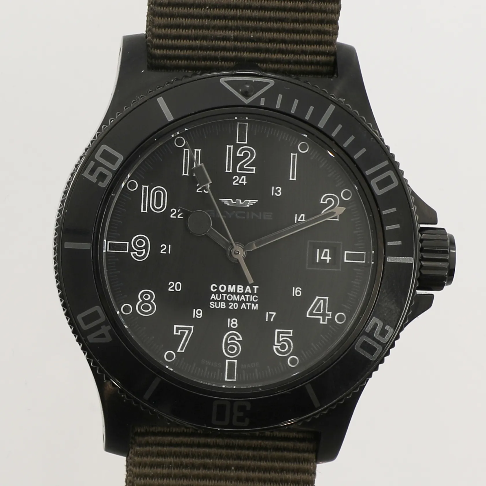 Herrur Glycine Combat Sub, stål, automatisk, 42mm, refnr GL0084, serienr 1020086, datum, tygarmband, box, ytterkartong.