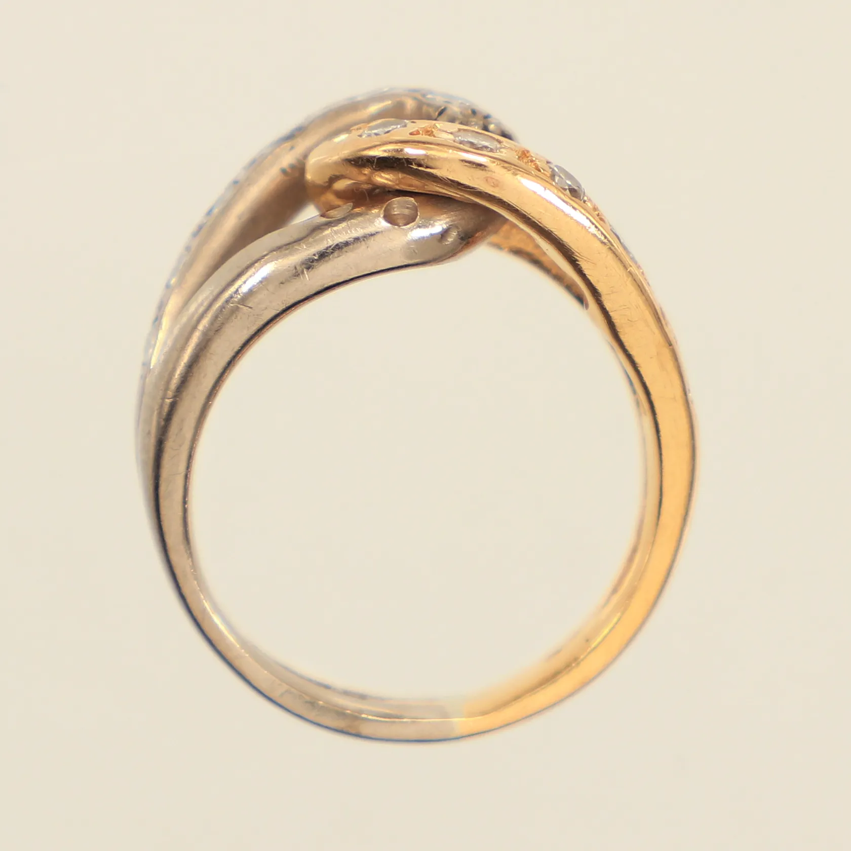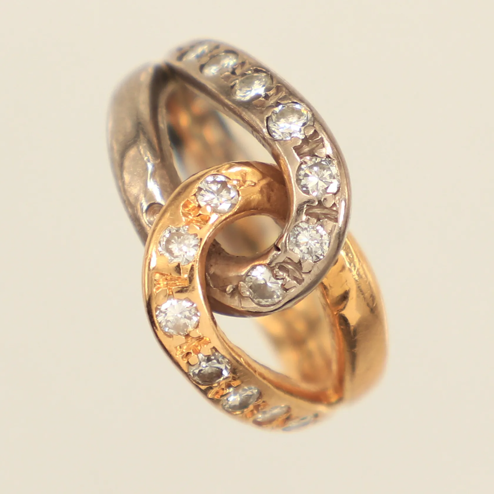Ring med diamanter 14x ca 0,02-0,03ct, ca sex stenar indikerar på syntet, stl 15½, bredd 3,4-10,5mm, år 1988, tvåfärgad, 18K Vikt: 7,2 g.