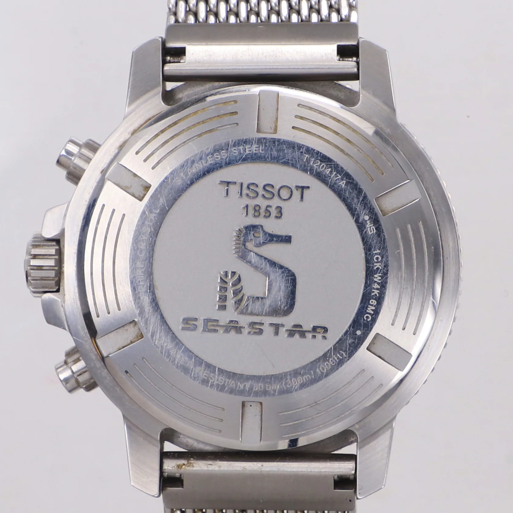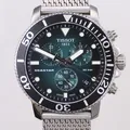 Herrur Tissot Seastar, chronograf, 30 bar, Ø45,5mm, 12,8mm, stål, grön urtavla, quartz, datum, T120417A, serienummer:1CKW4K6MCC, meshband i stål, viklås, batteribyte krävs, lätta repor, år 2020, med tillbehör, originalask