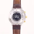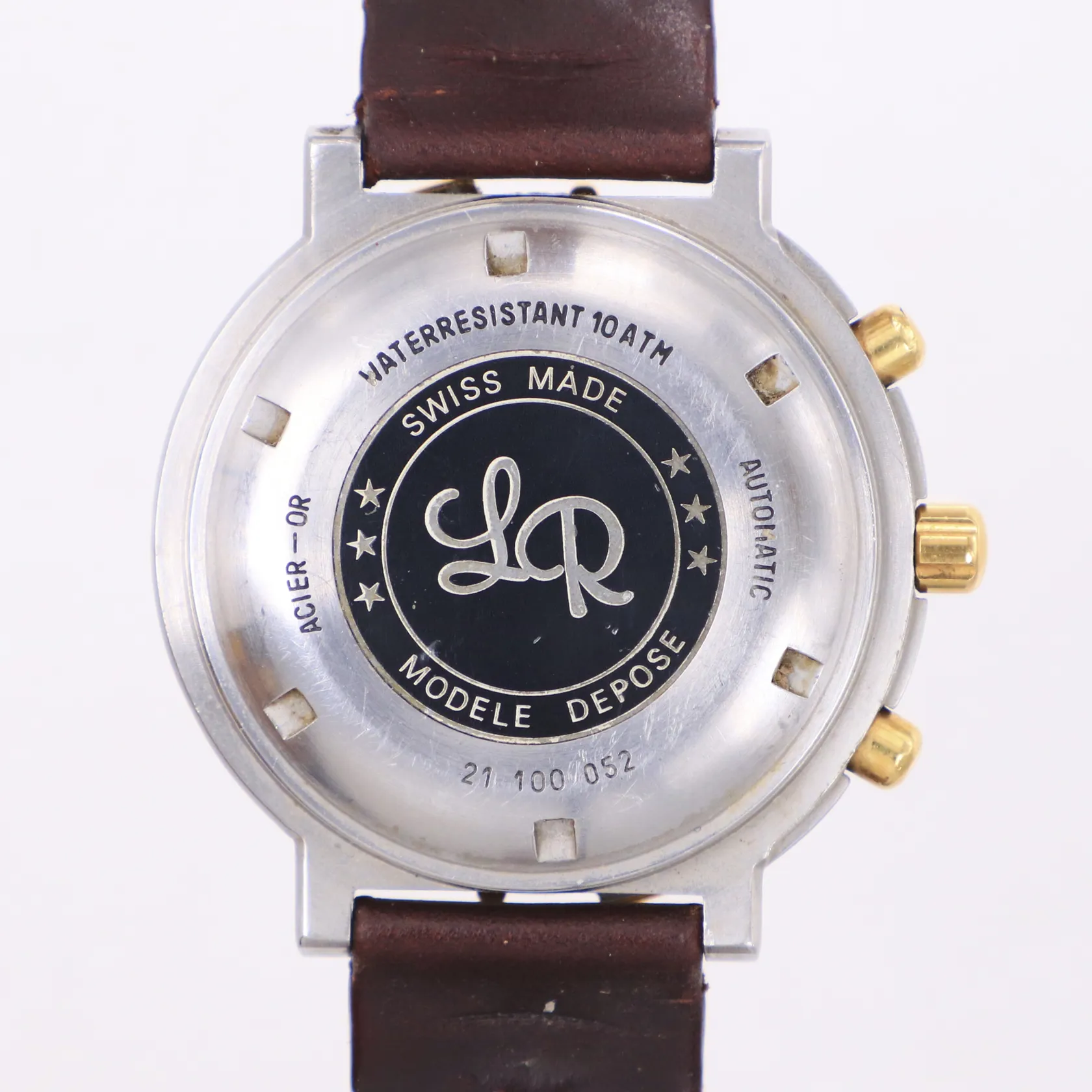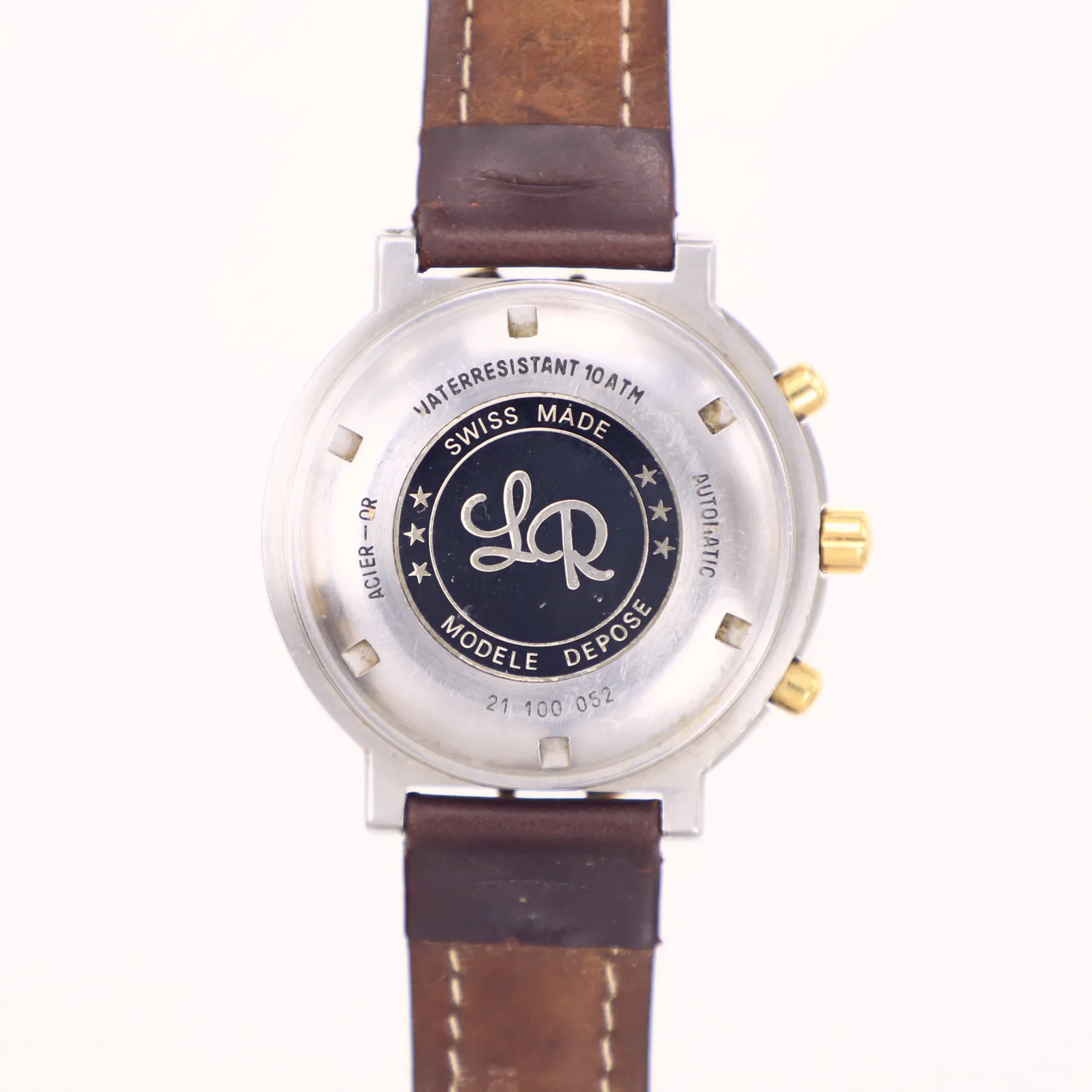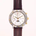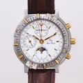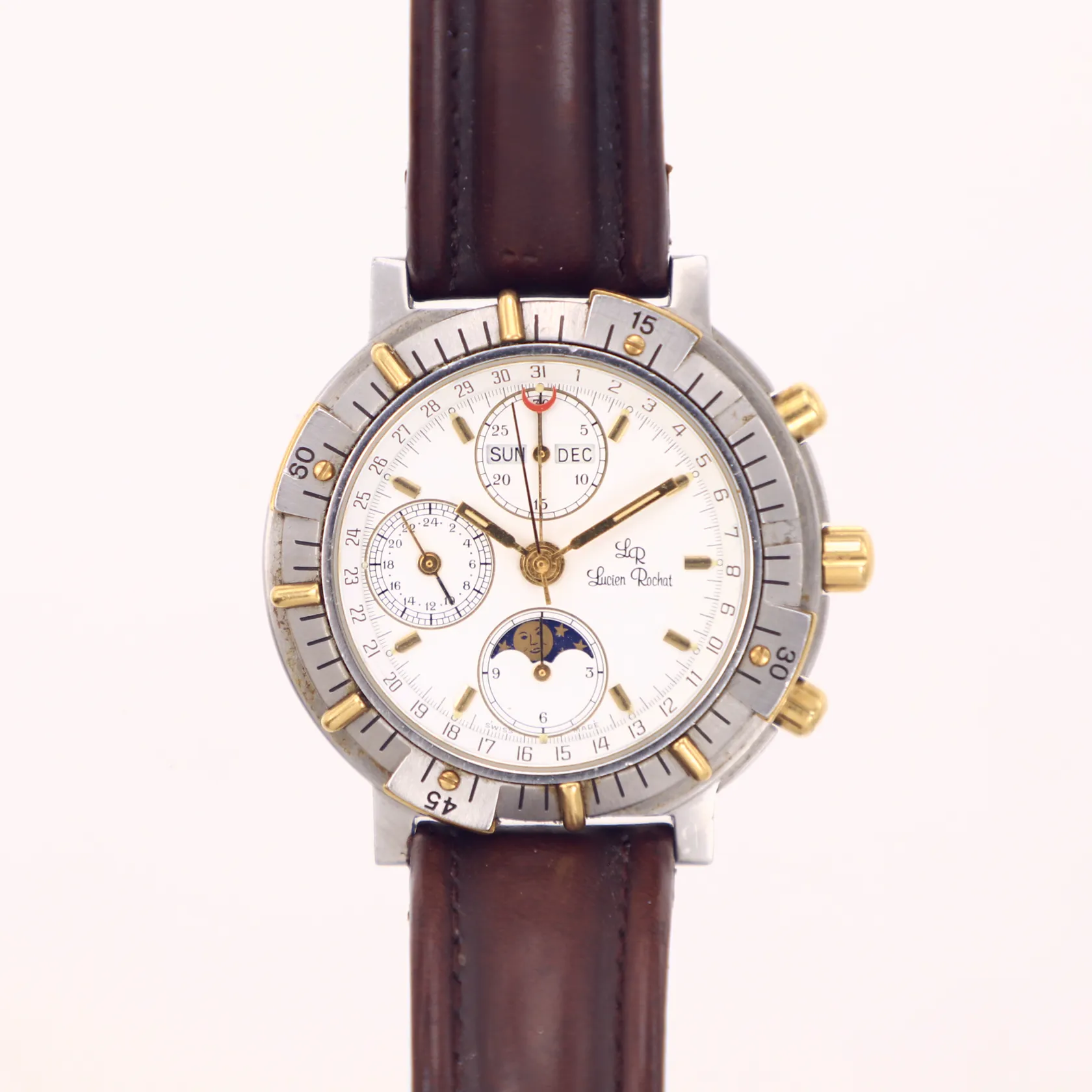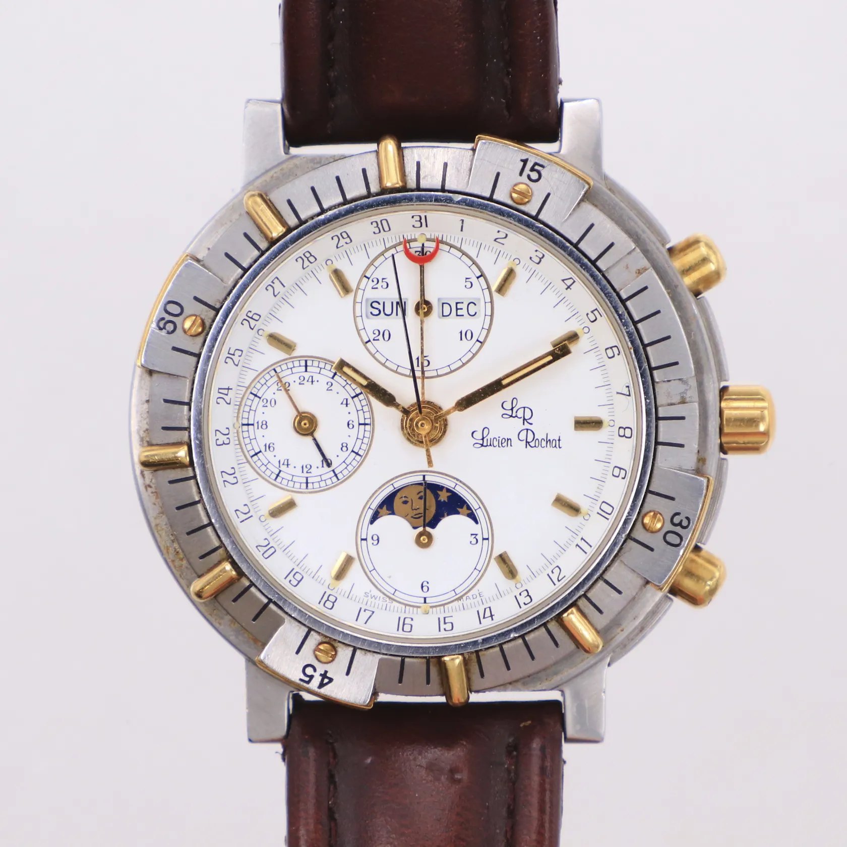 Herrur, Lucien Rochat, Royal Air Chronograph GMT Moonphase, day date, Ø42mm, ref nr 21100052, stål-guld, Modele depose, automatisk, kronograf, vit urtavla, safirglas, trög vridring, slitna knappar, läderband ej original, inga tillbehör, bruksskick