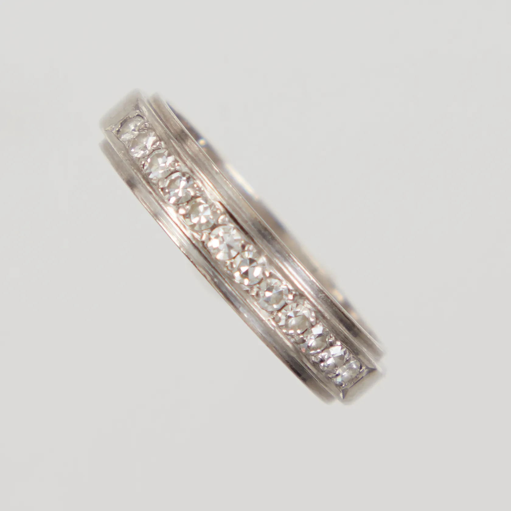 Ring stl 17½, bredd 4,3mm, åttkantslipade diamanter 12x ca 0,02ct, gravyr, vitguld, 18K Vikt: 5 g.