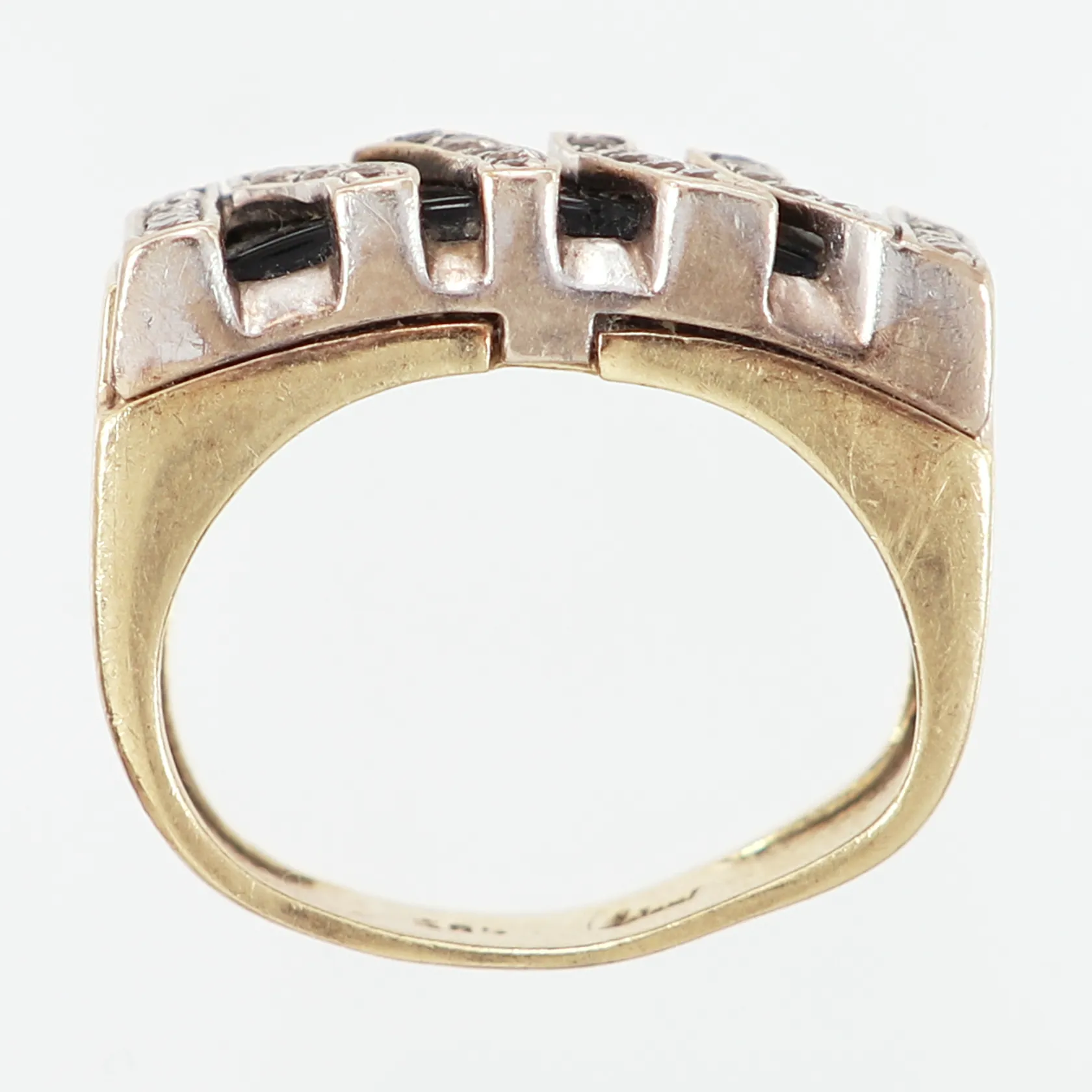 Ring med vita samt svarta stenar, stl ca, 16½, bredd: 5-8mm, skev skena, nagg på svart sten, 14K Vikt: 9,3 g.