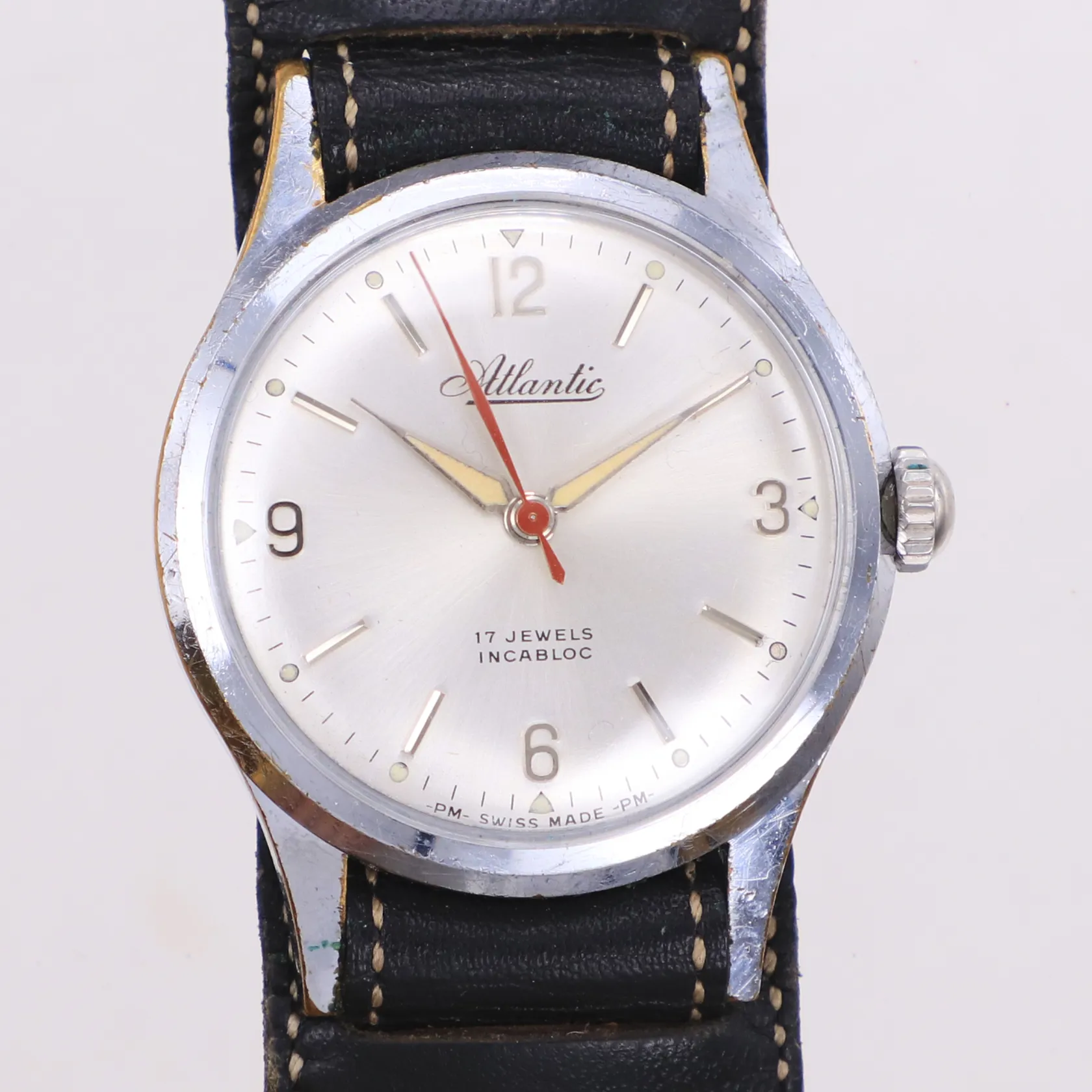 Armbandsur, Ø33mm, Atlantic, 17 Jewels, Kvalitetsur, repor/slitage på boett, slitet läderband