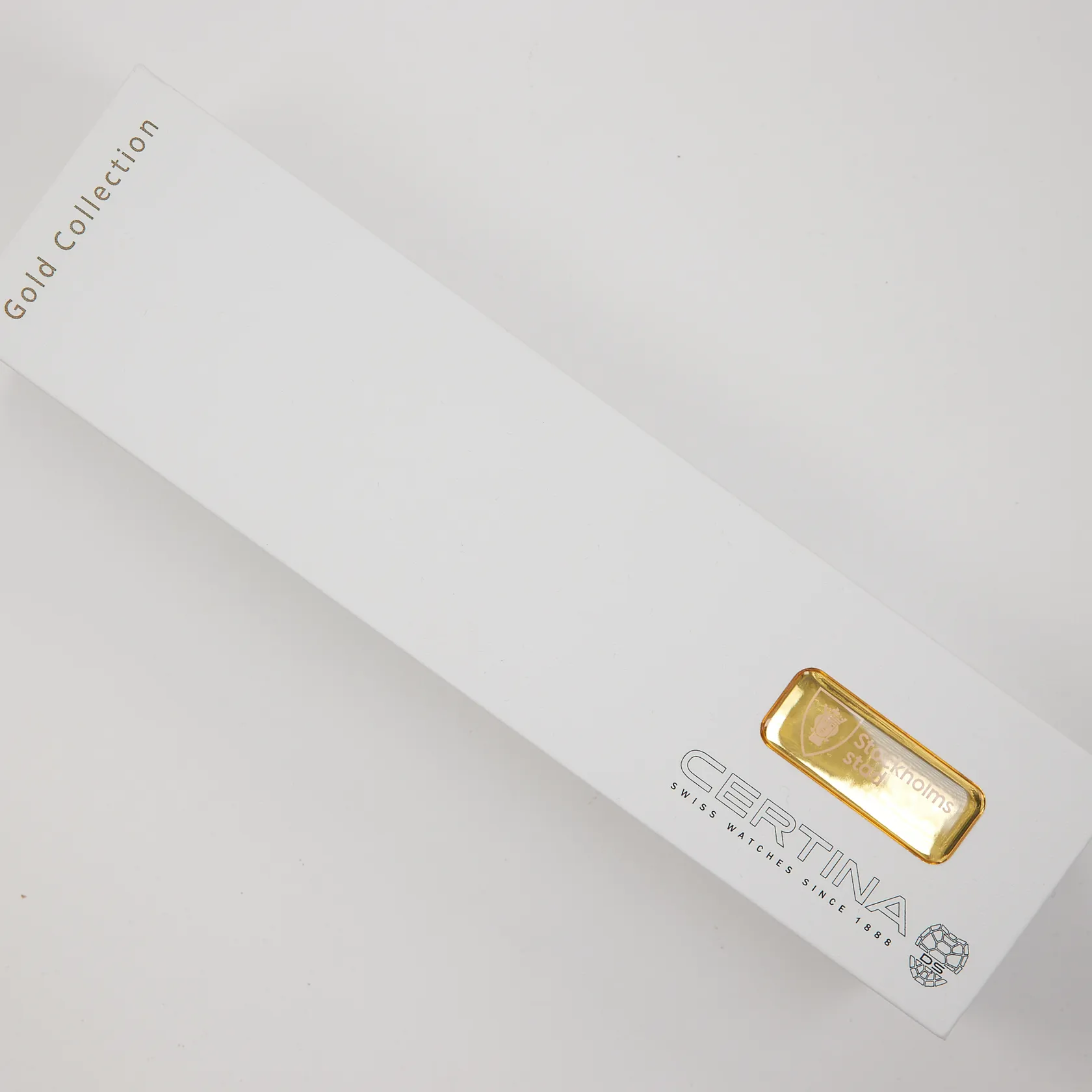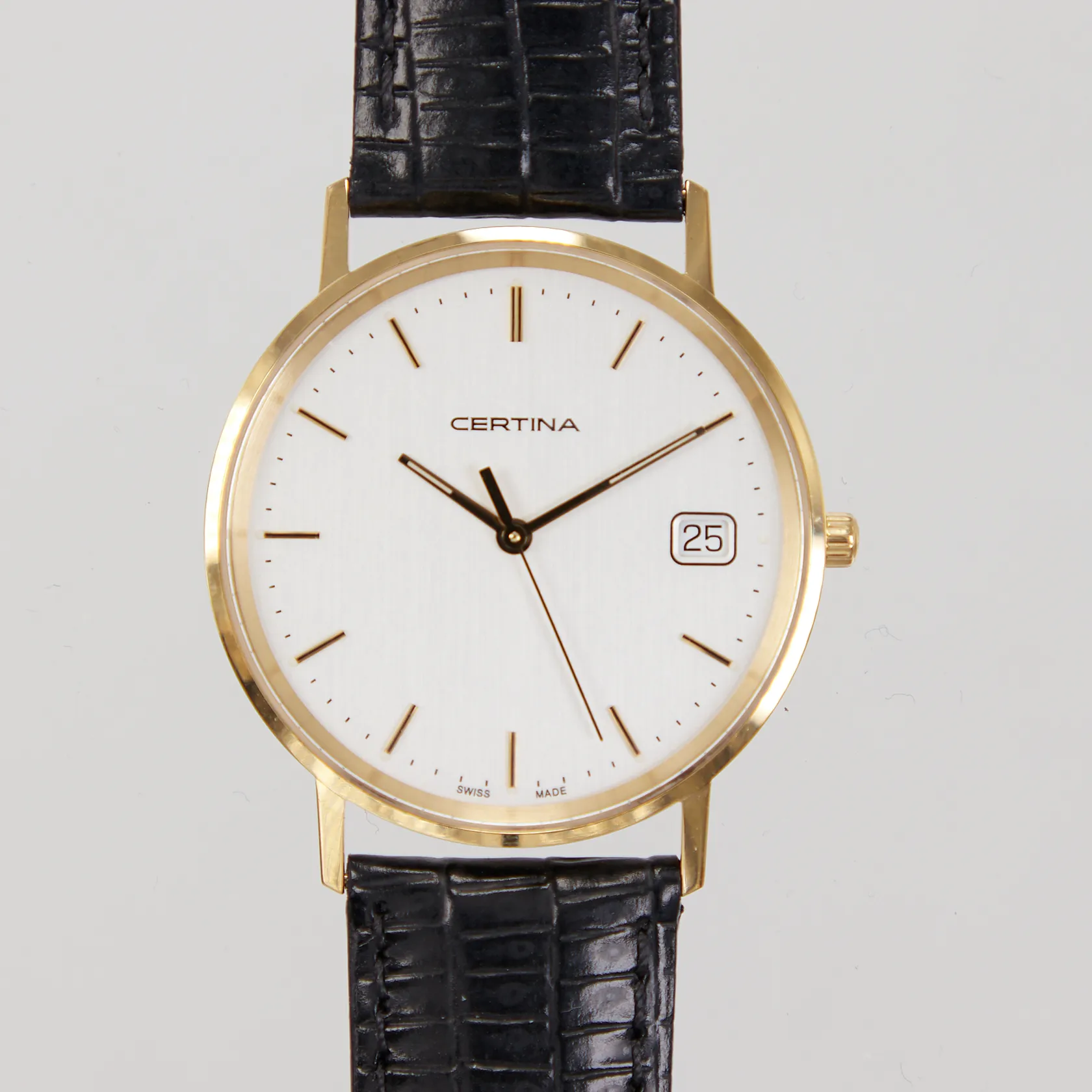 Herrur Certina, 18K, quartz, ref: 158.9289.68, Ø34mm, datum, originalläderband, certifikat 2020, box, ytterkartong, gravyr, batteribyte krävs