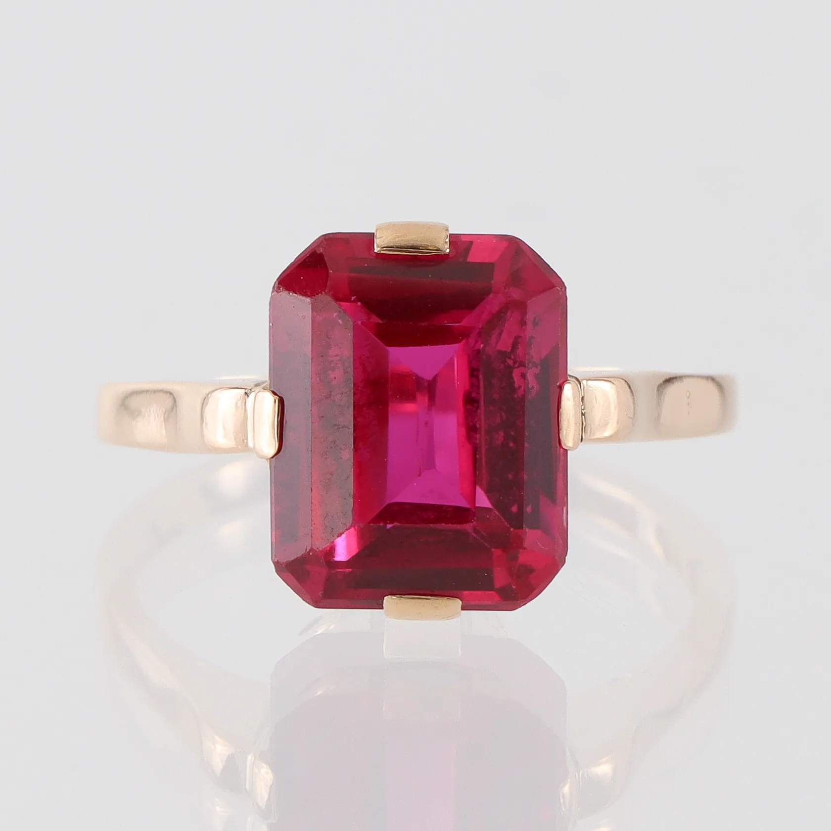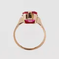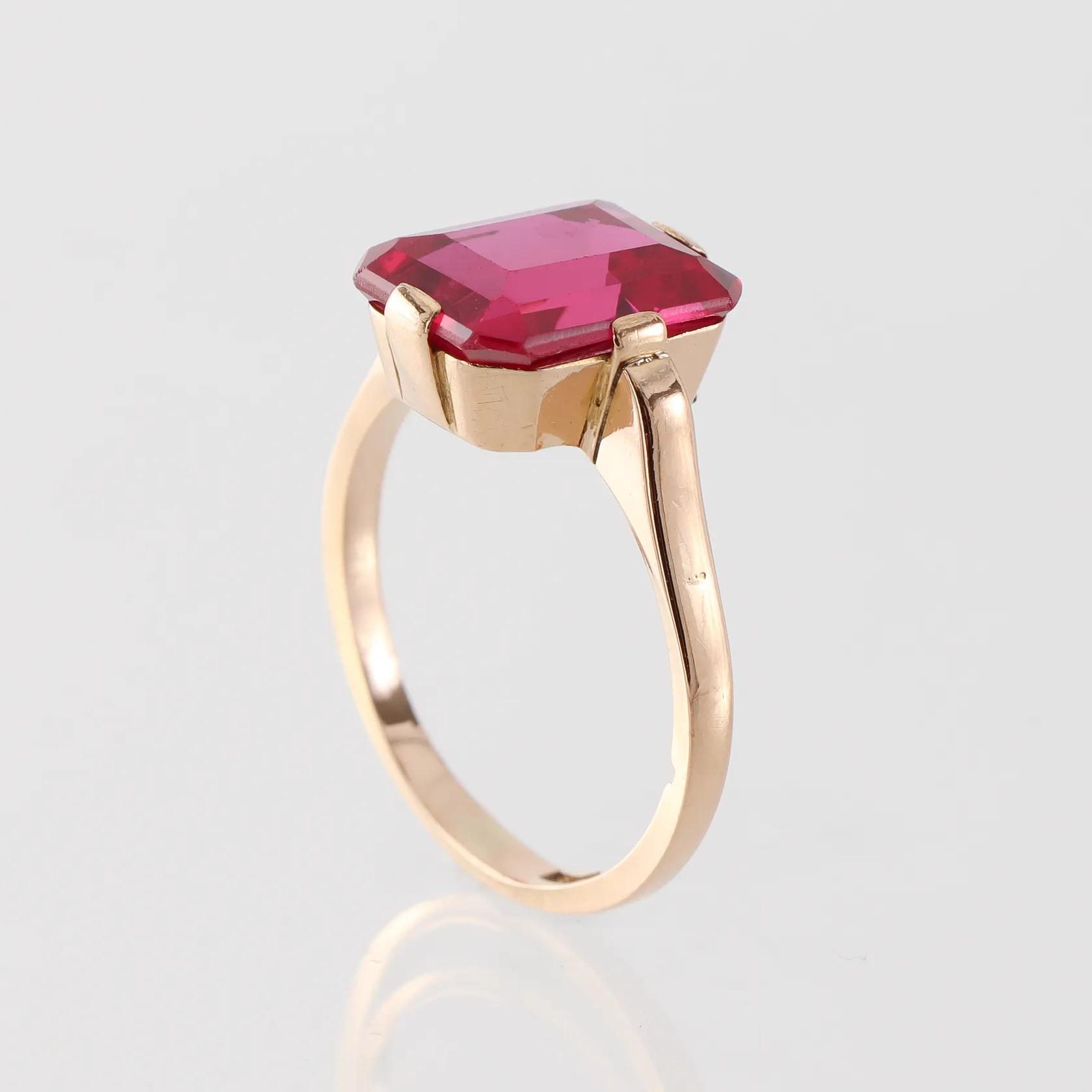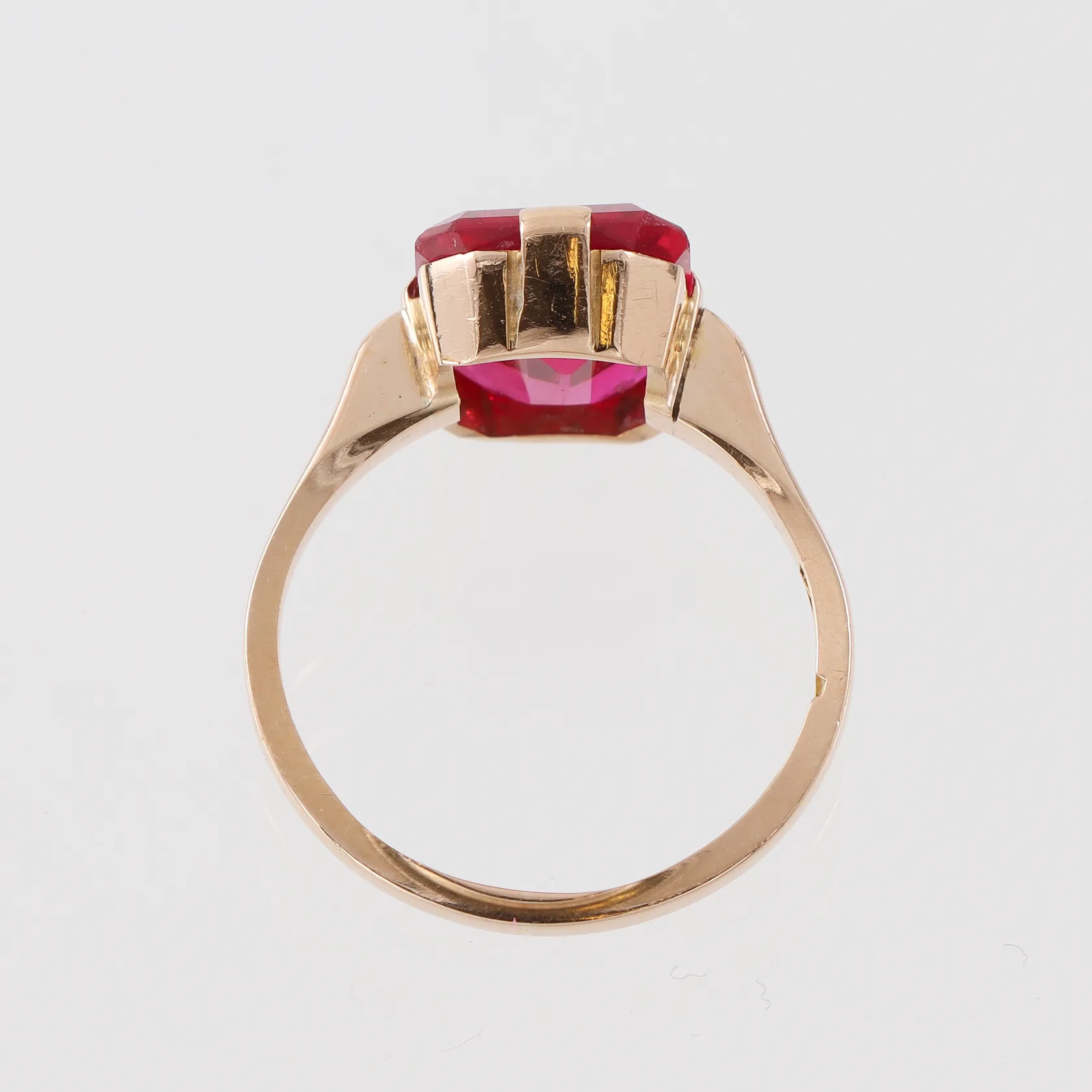 Ring med röd sten något rörlig, storlek 16 ¾ mm, bredd 2-11.7 mm, 18k. Vikt: 3,9 g.