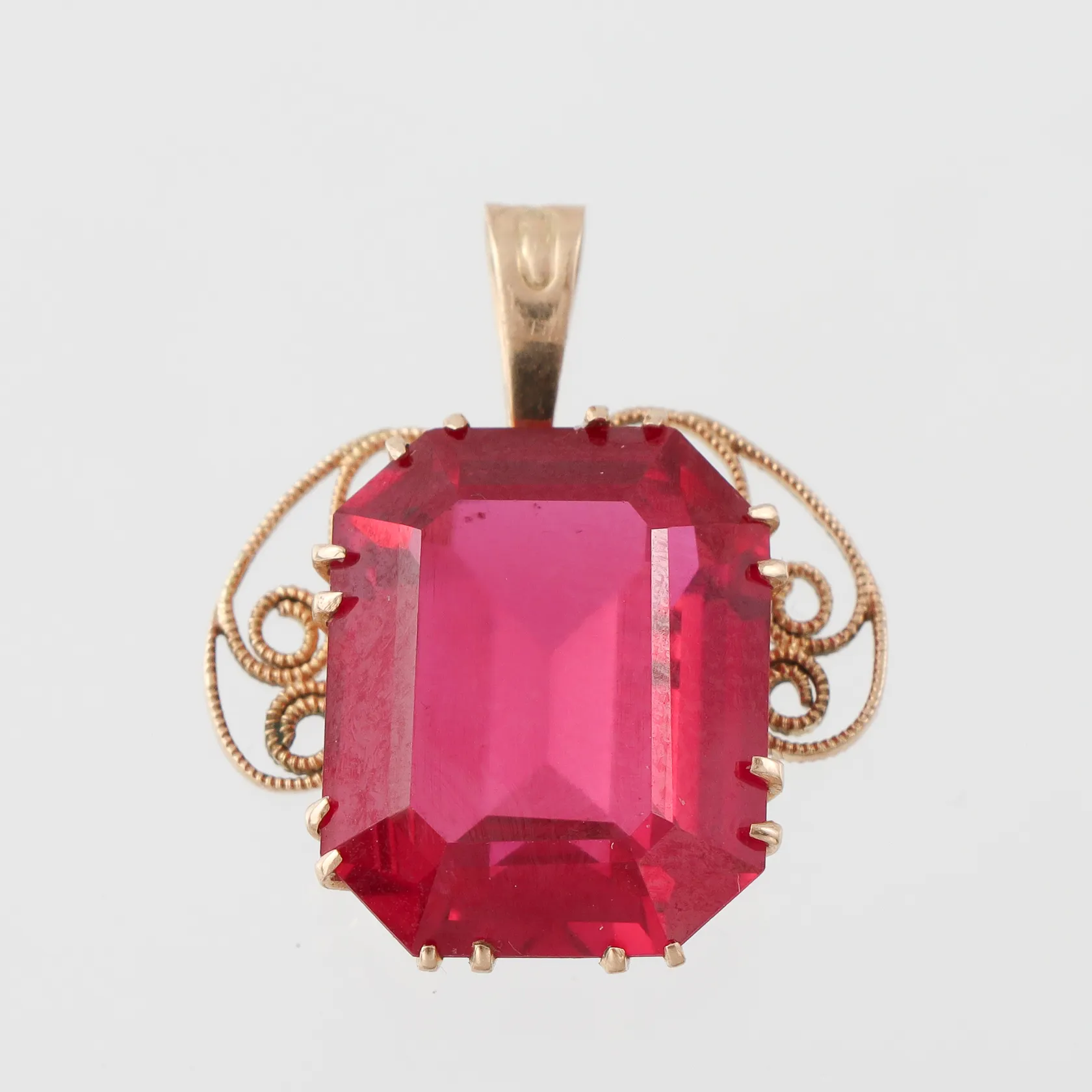 Hänge med röd sten, höjd med ögla ca 22 mm, Finland, 14k. Vikt: 3,7 g.