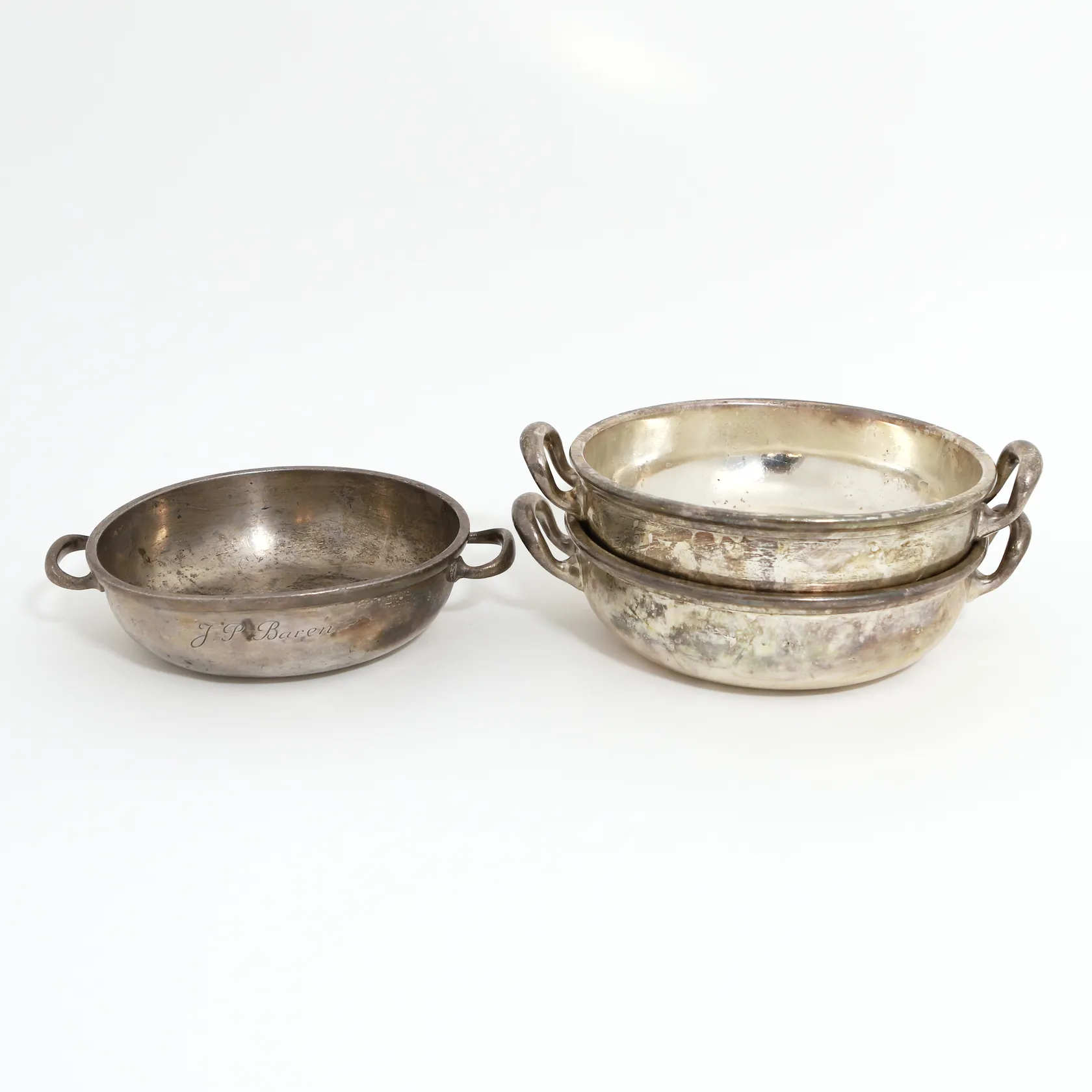 Tre uppläggningsskålar Gebruder Hepp i vitmetall, Ø20-23cm, höjd: 6-7cm, Tyskland, slitage samt en med gravyr Skickas med postpaket.