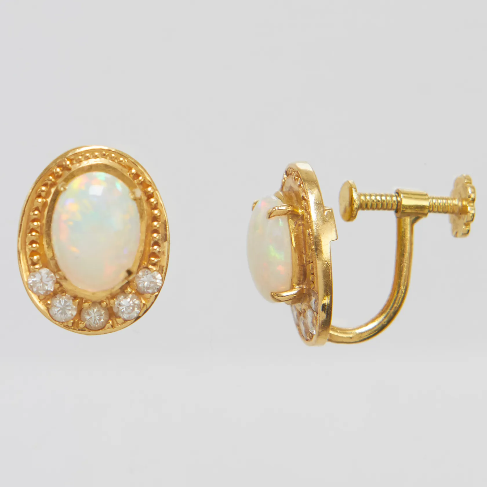 Ett par örhängen cabochonslipade kristallopaler, en något lös i fattning, vita stenar, 13,9x10,9mm, skruvclips, 18K Vikt: 5,6 g.
