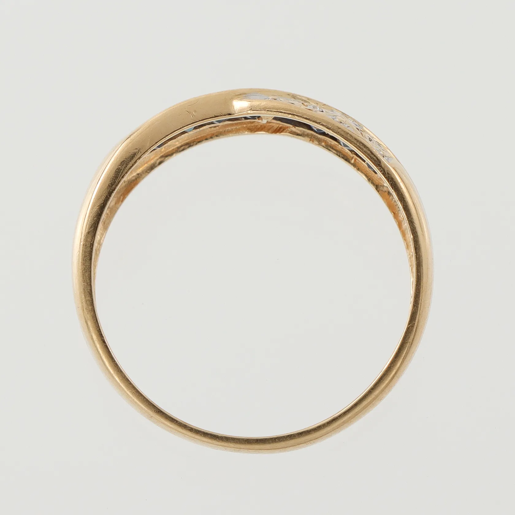 Ring med safirer och diamanter ca 4x0,005ct, Guldfynd AB, storlek 18 mm, bredd 2.2-6.7 mm, 18k. Vikt: 3,1 g.
