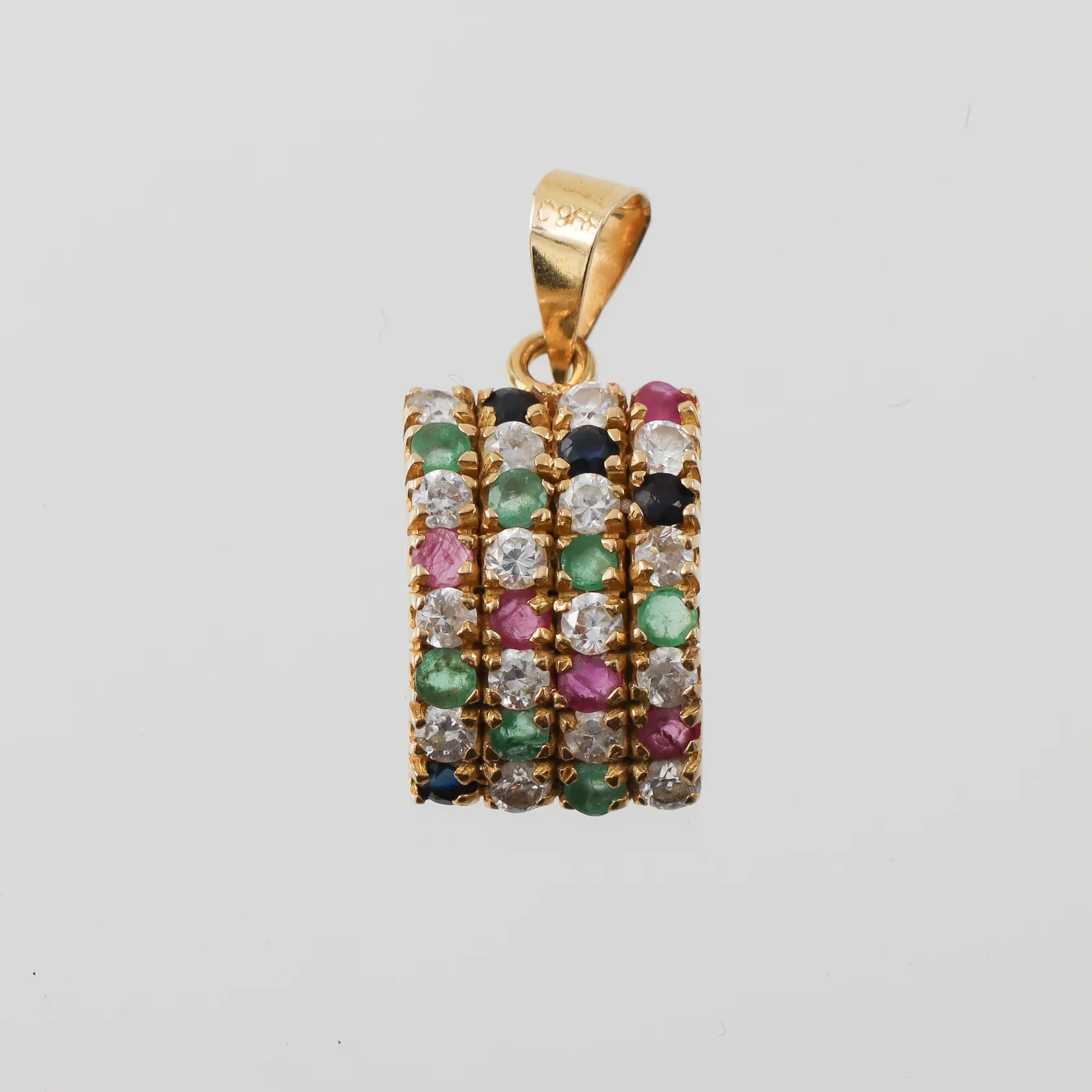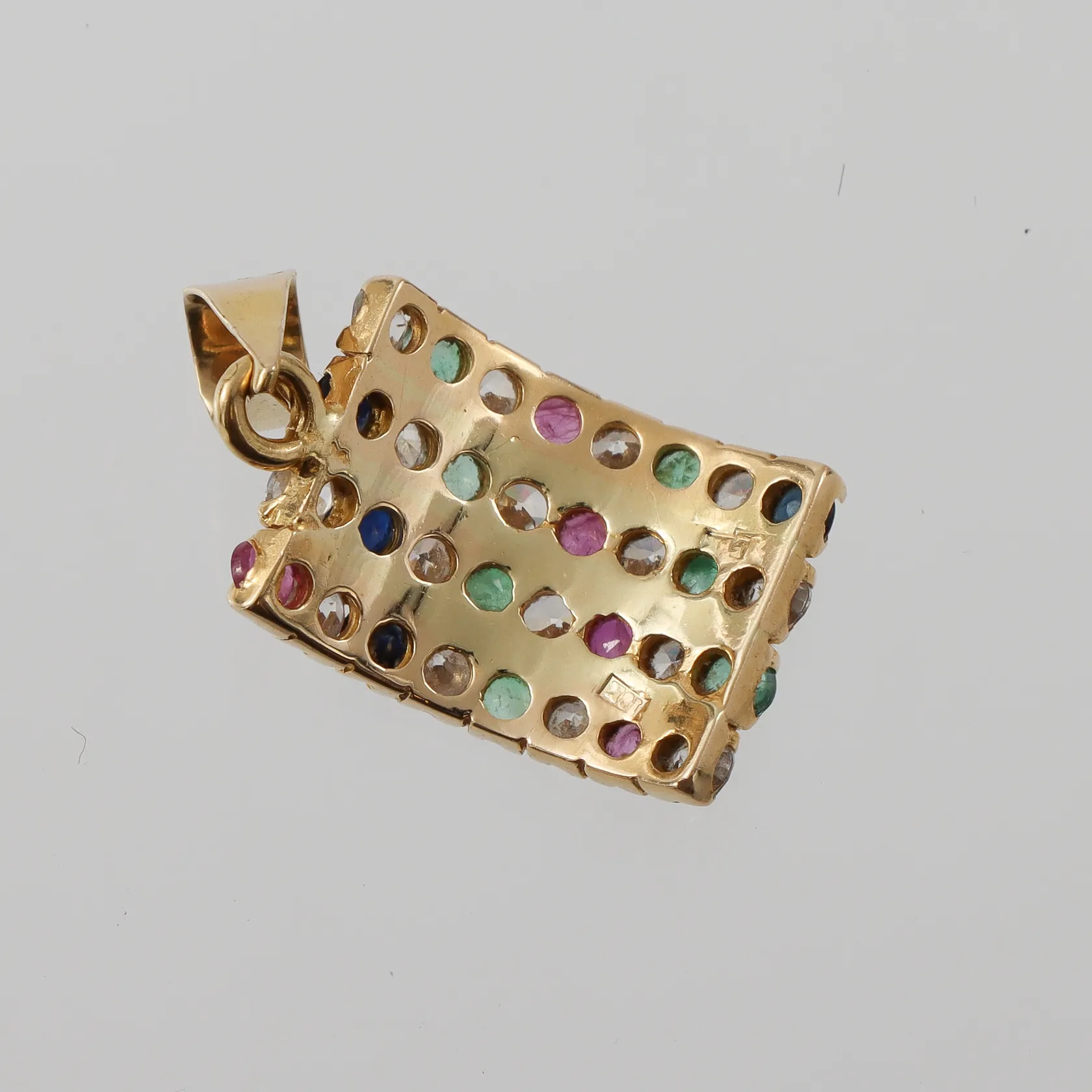 Hänge med stenar rubiner, smaragder och Kubis zirkonia, höjd med ögla 22 mm, 18k. Vikt: 2,7 g.