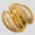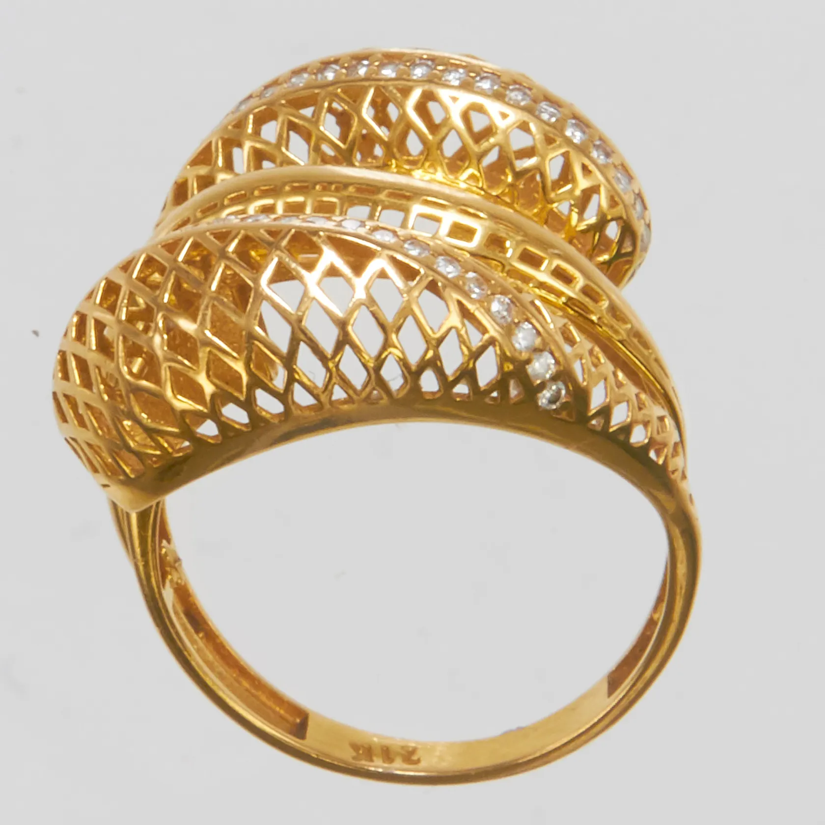 Ring, vita stenar, stl 18½, höjd 0,9-7,5mm, bredd 2,5-22,7mm, genombruten dekor, 21K Vikt: 6,9 g.