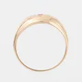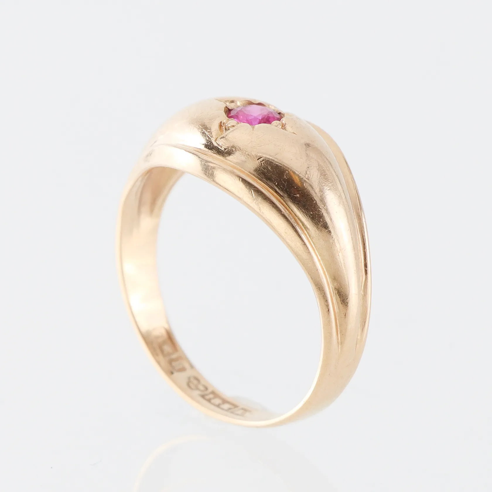 Ring med syntetisk rubin, Kaplan Stockholm, storlek 15 mm, bredd 2.3-9.3 mm, 18k. Vikt: 2,9 g.