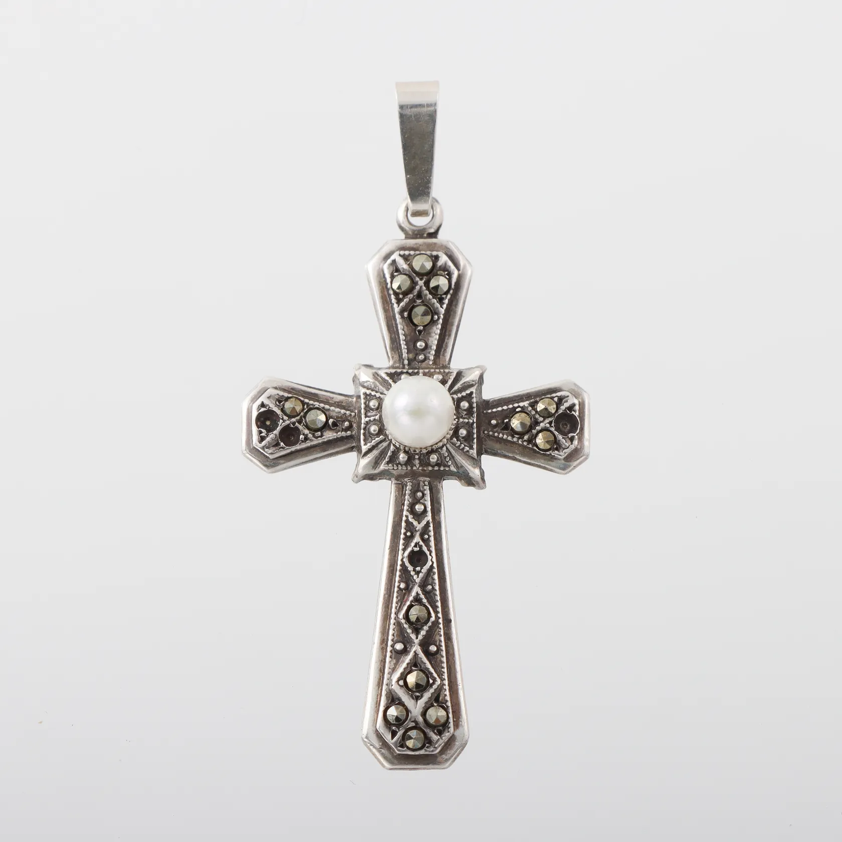 Hänge med pärla och markasiter där 4st saknas, höjd med ögla 40 mm, silver. Vikt: 3 g.