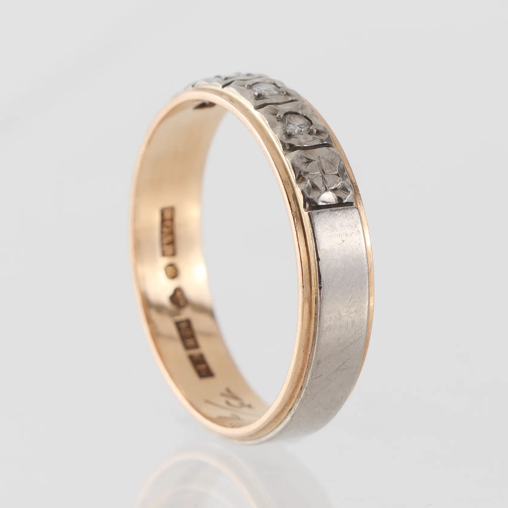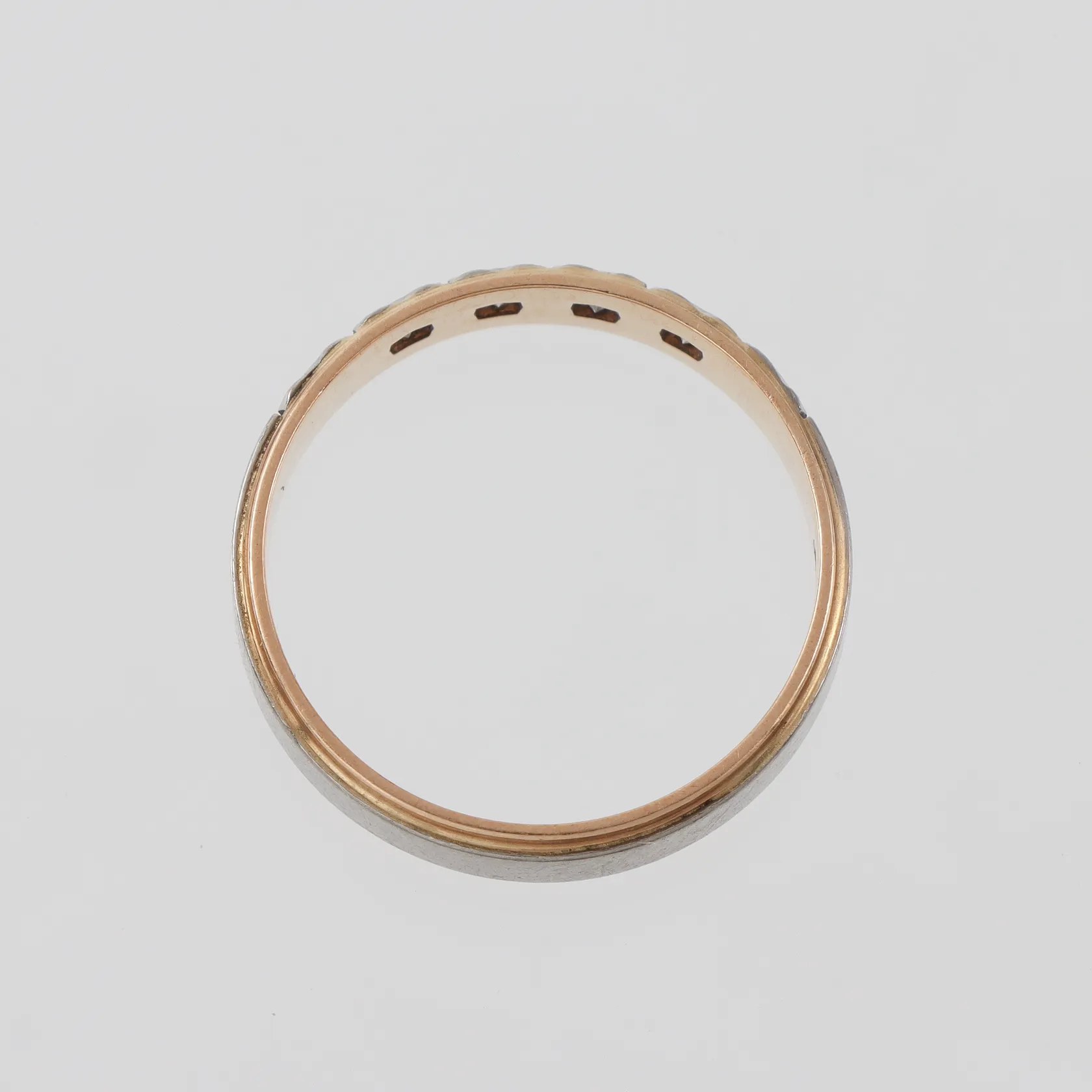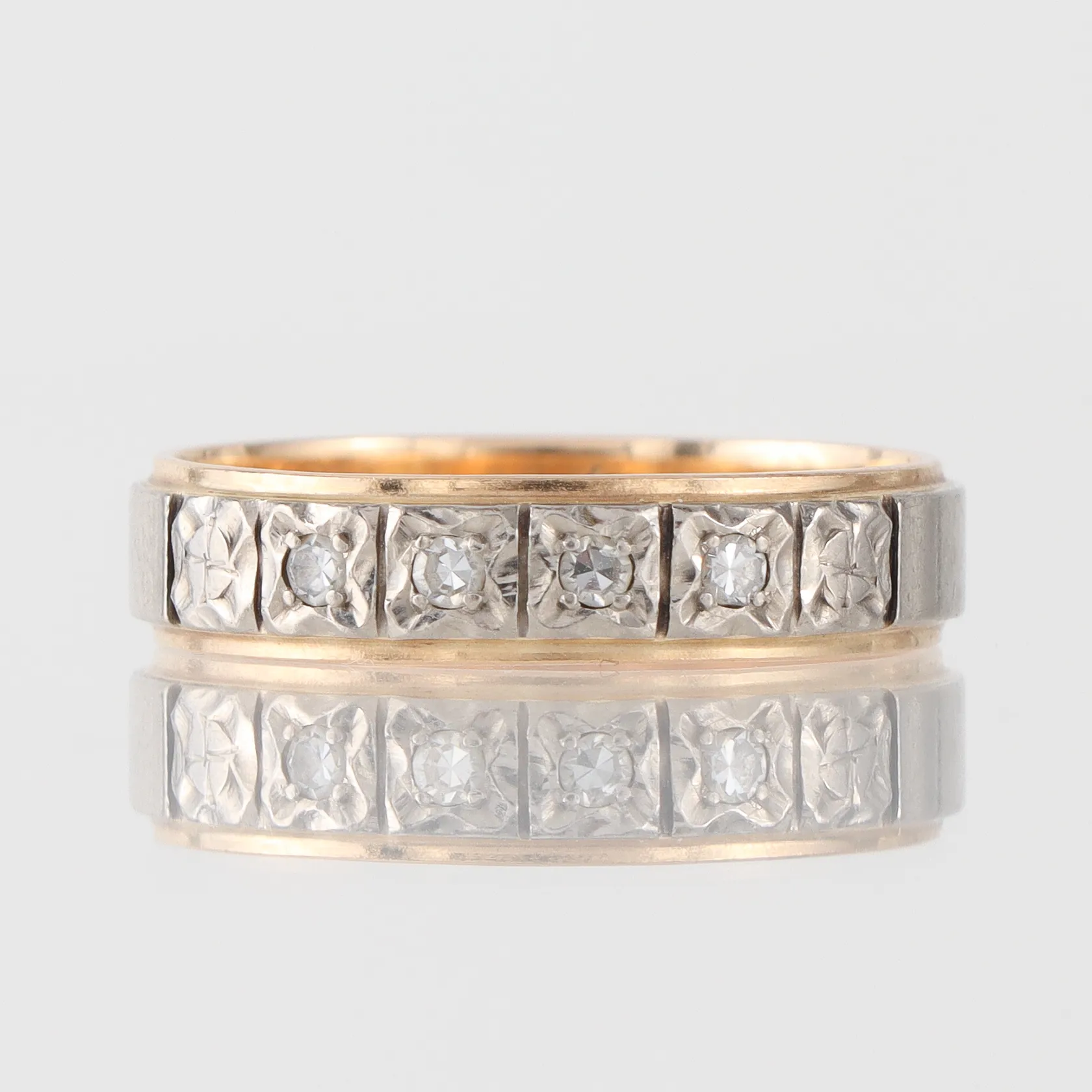 Diamantring 18k tvåfärgad med diamanter ca 4x0,03ct, storlek 19 ½ mm, bredd 5 mm, Rahlens Guldsmeds Ab Borås 1977 Vikt: 5,1 g.